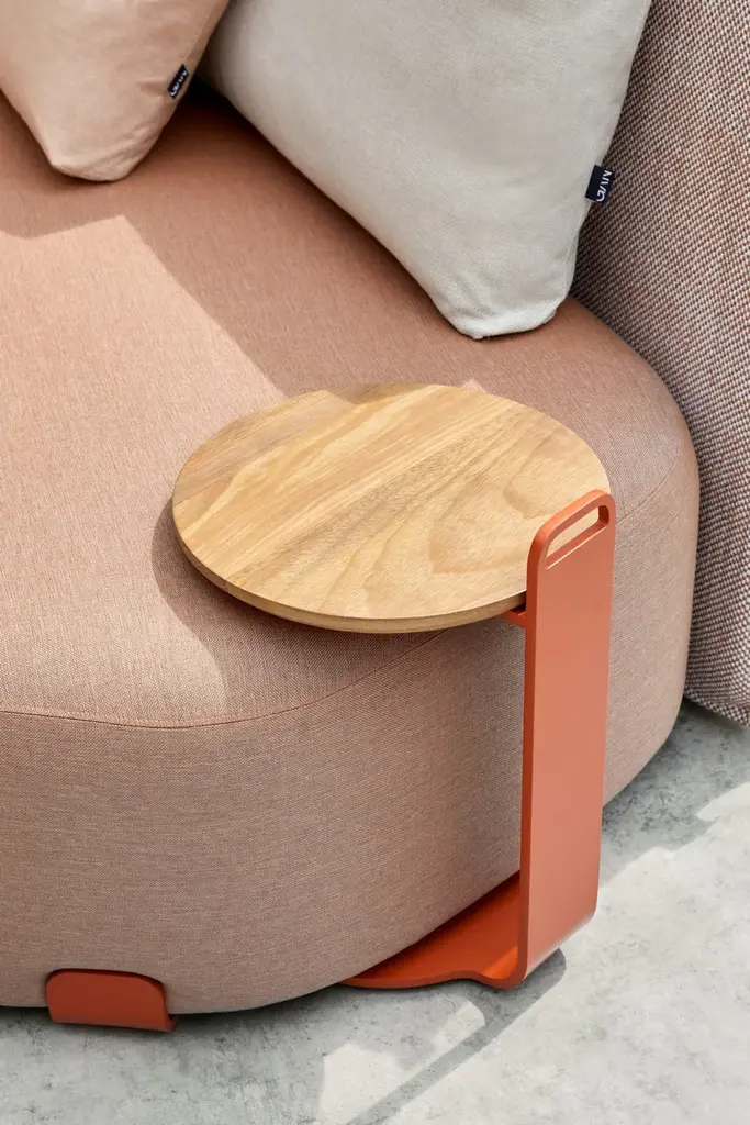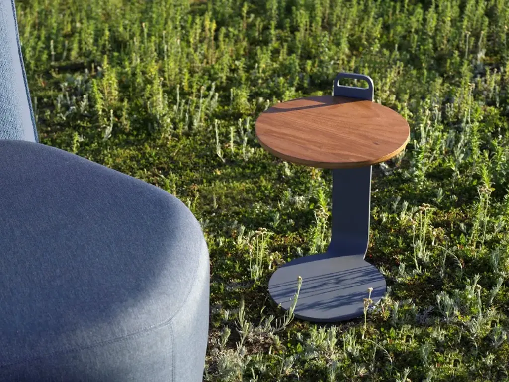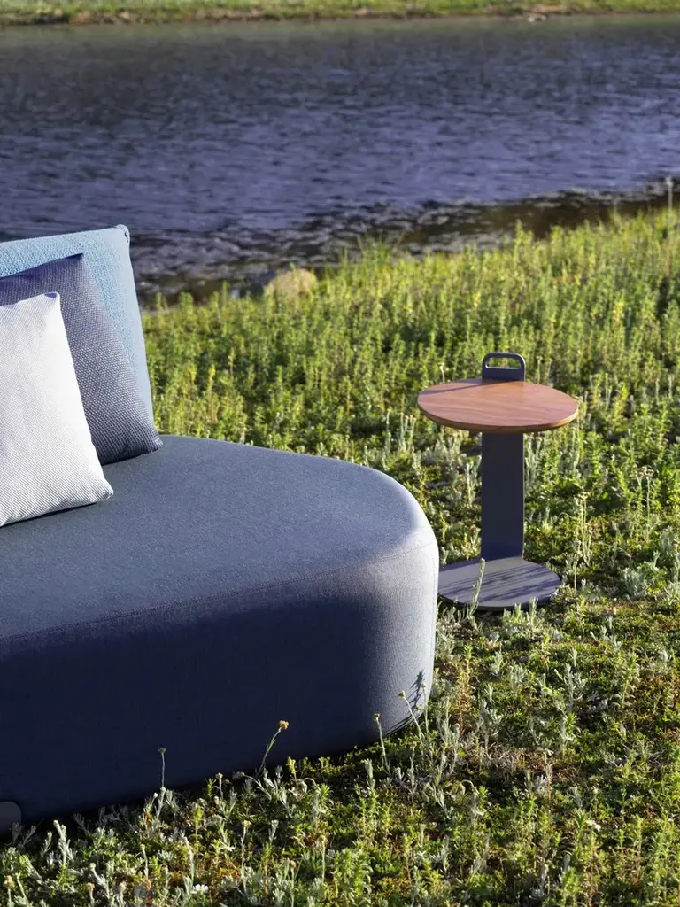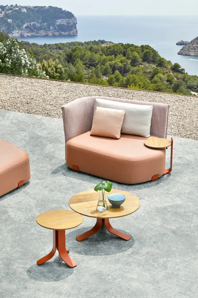 Isla is a round garden side table by GAN, design by Sebastian Herkner.Powder-coated aluminum frame.Iroko wood or porcelain top table.Perfectly irregular volumes.ISLA is a versatile and attractive outdoor collection, designed by Sebastian Herkner. In his first collaboration with GAN, the German designer explores the concept of modularity and outdoor living, through comfortable volumes and irregular shapes.Its three modules can be used independently or in combination to generate multiple configurations that adapt to each space, always paired with the collection’s tables and cushions. Enjoy creating your own archipelago.Menorca, Gomera and Arosa, the three modules in ISLA, are offered in seven color combinations: Coral, Sand, Shell, Blue, Green, Silver and Garnet.