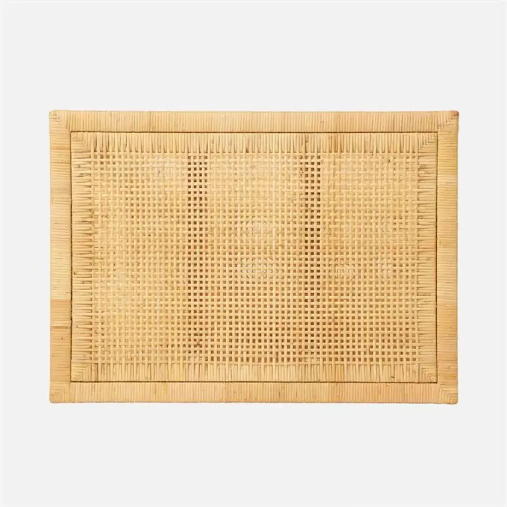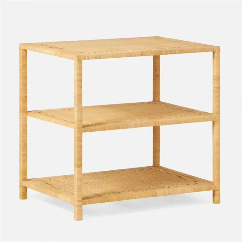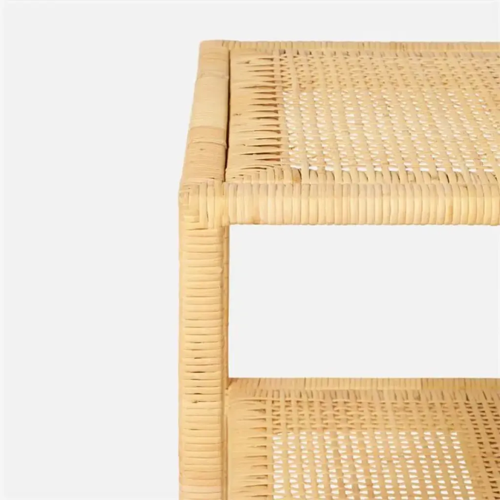 The new Isla side table is an inviting expanse of tightly woven peeled rattan, reinforced by a box-stretcher frame. A peeled rattan lower shelf is semi-enclosed by two square, woven rattan panels at each corner.