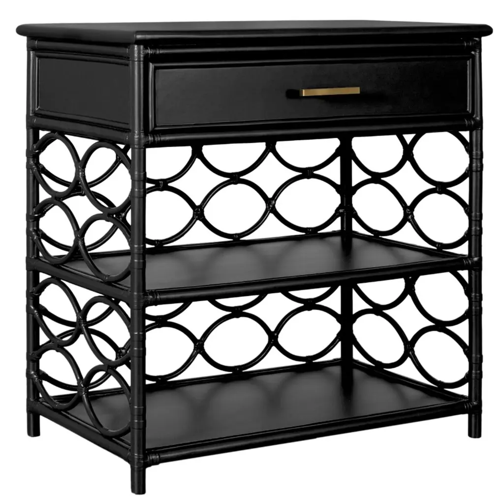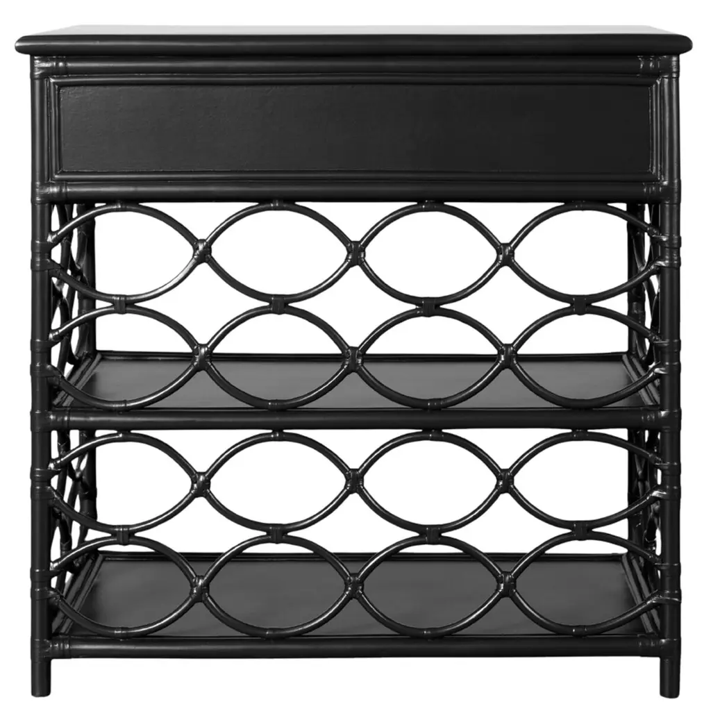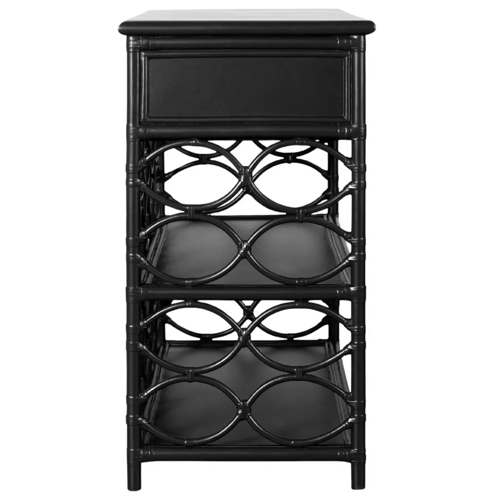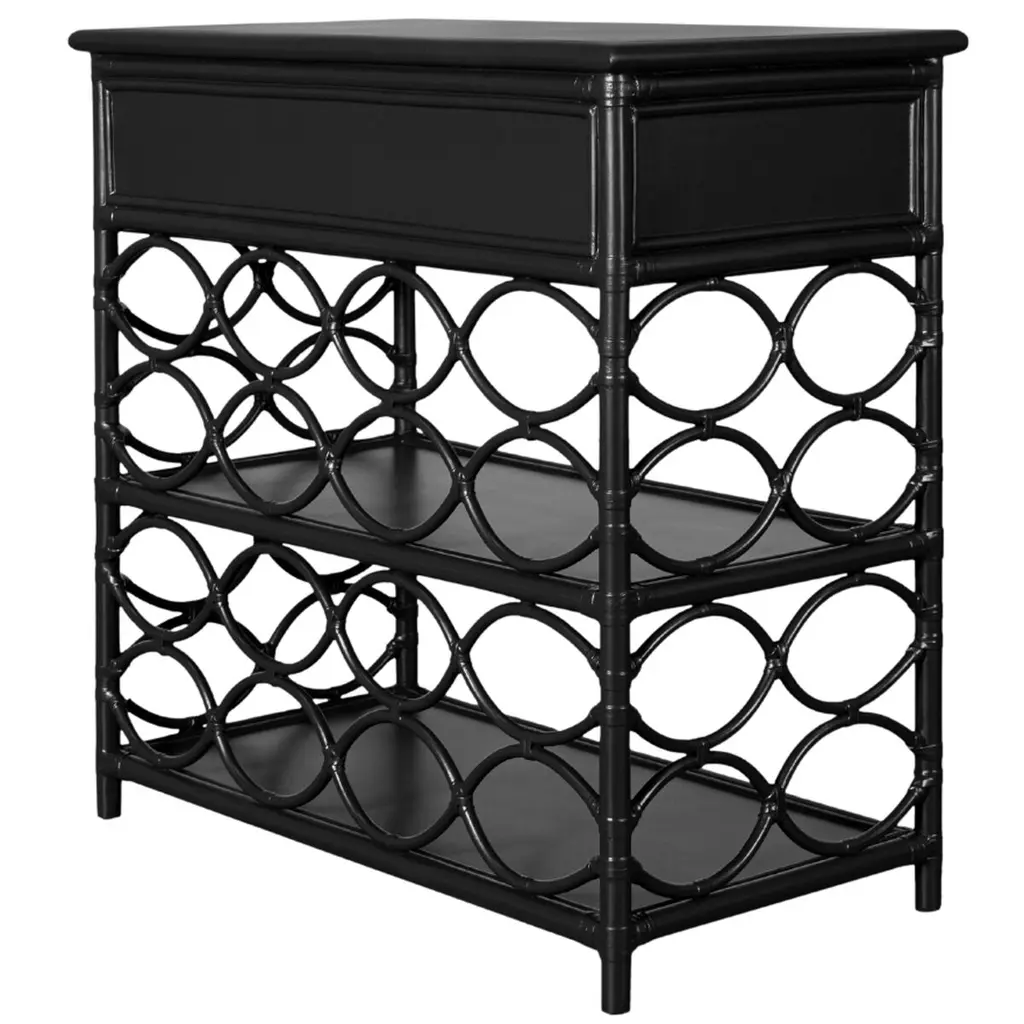 Showcasing hand-arched circular fretwork and a black finish, this side table is crafted of rattan with rawhide bindings for added strength and textural contrast. Its two wooden shelves and single drawer offer a wealth of storage space. An anti-tip kit is included to secure this piece to the wall and prevent tipping.