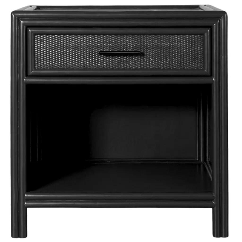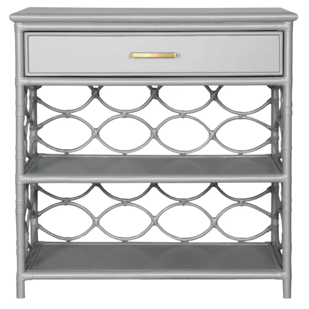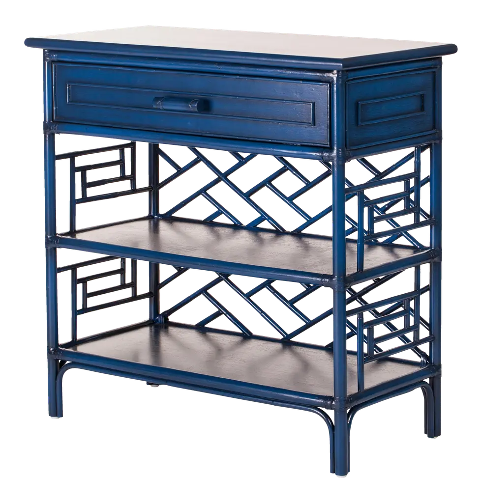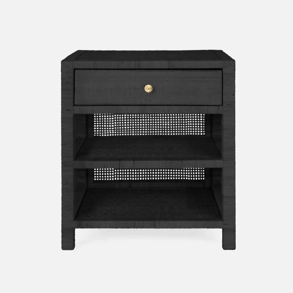 Showcasing hand-arched circular fretwork and a black finish, this side table is crafted of rattan with rawhide bindings for added strength and textural contrast. Its two wooden shelves and single drawer offer a wealth of storage space. An anti-tip kit is included to secure this piece to the wall and prevent tipping.