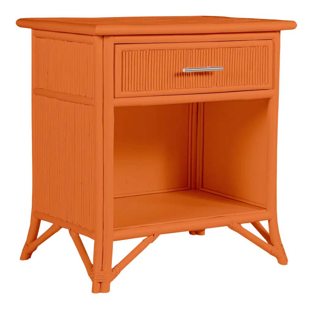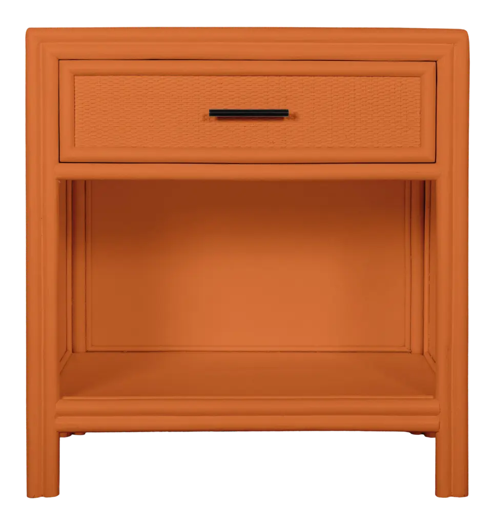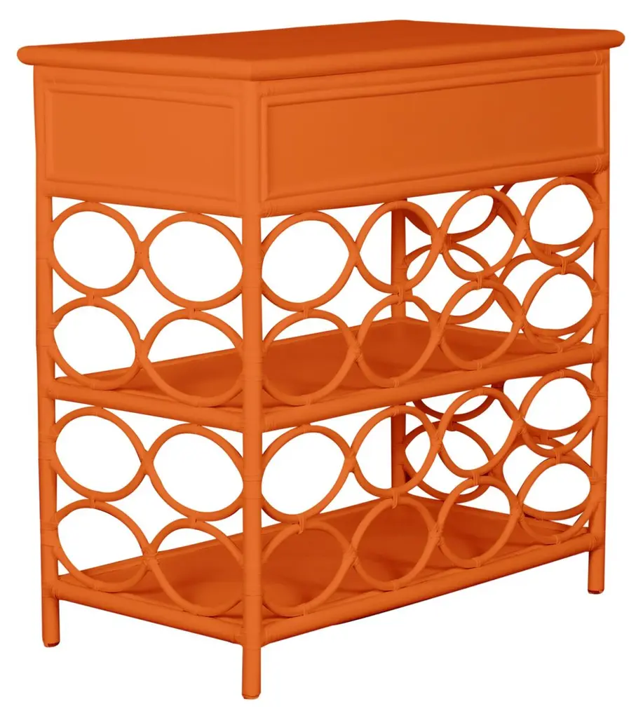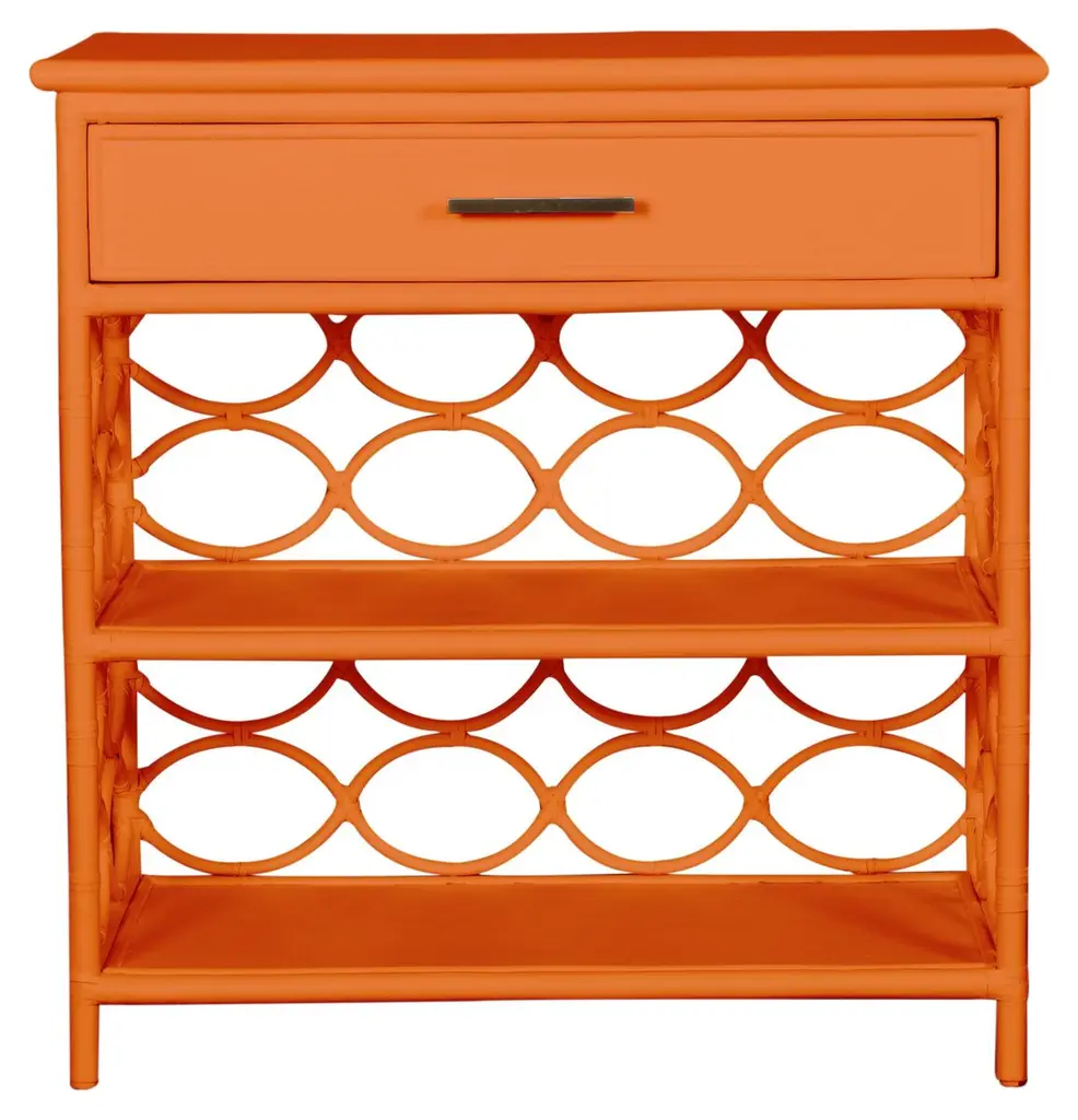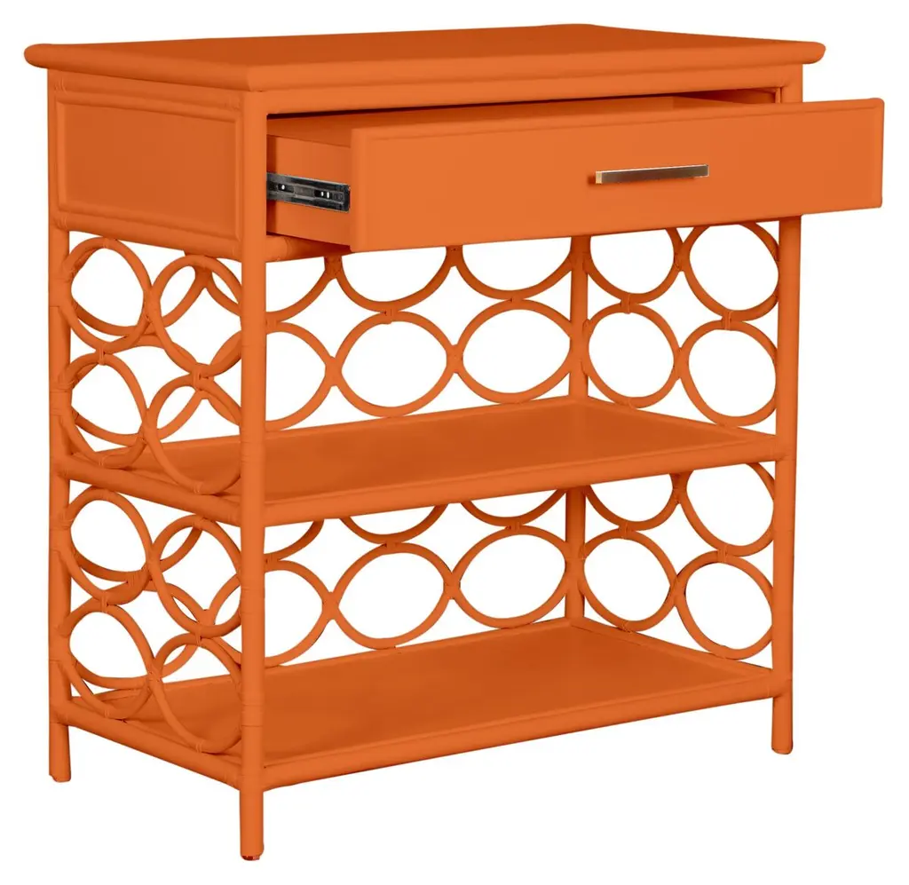 Showcasing hand-arched circular fretwork and a bright orange finish, this side table is crafted of rattan with rawhide bindings for added strength and textural contrast. Its two wooden shelves and single drawer offer a wealth of storage space. An anti-tip kit is included to secure this piece to the wall and prevent tipping.