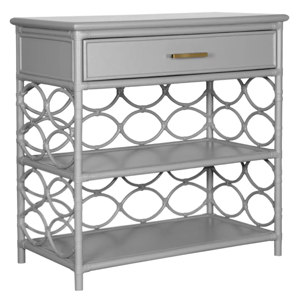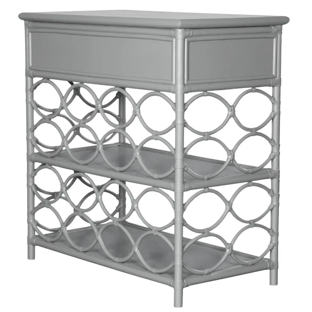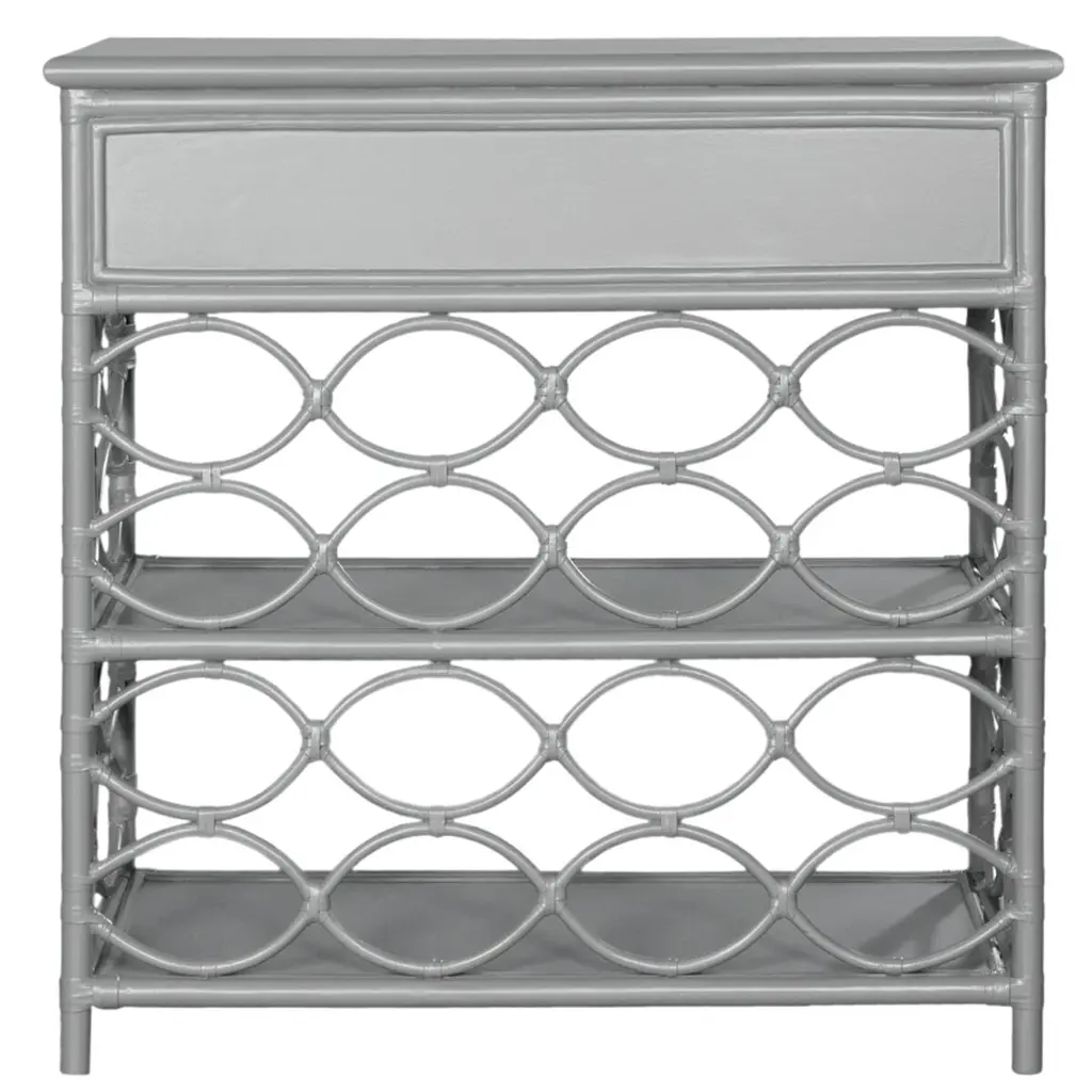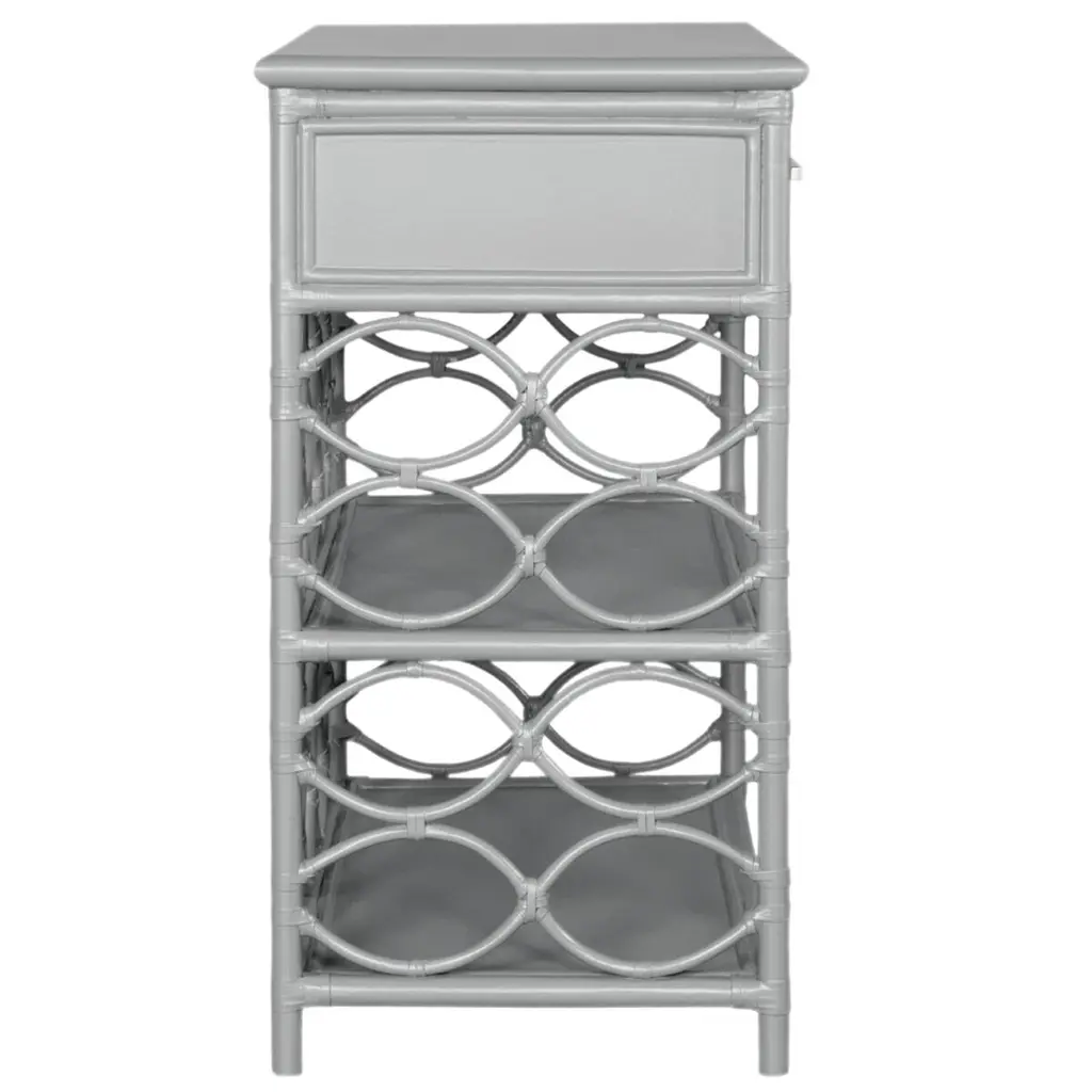 Showcasing hand-arched circular fretwork and a light gray finish, this side table is crafted of rattan with rawhide bindings for added strength and textural contrast. Its two wooden shelves and single drawer offer a wealth of storage space. An anti-tip kit is included to secure this piece to the wall and prevent tipping.