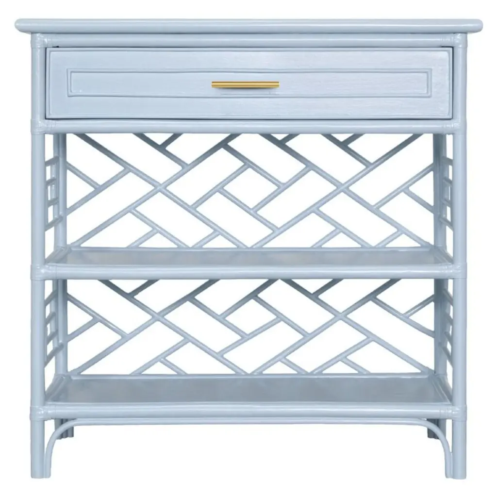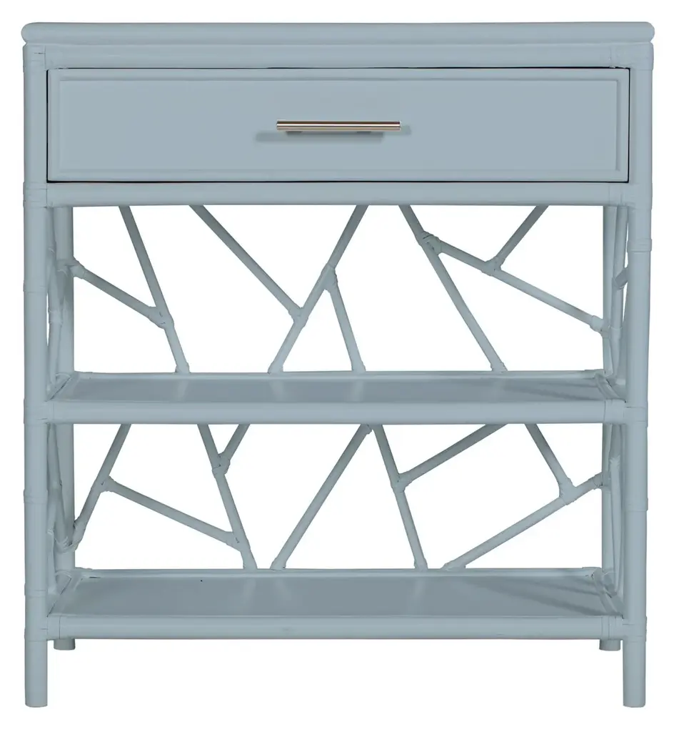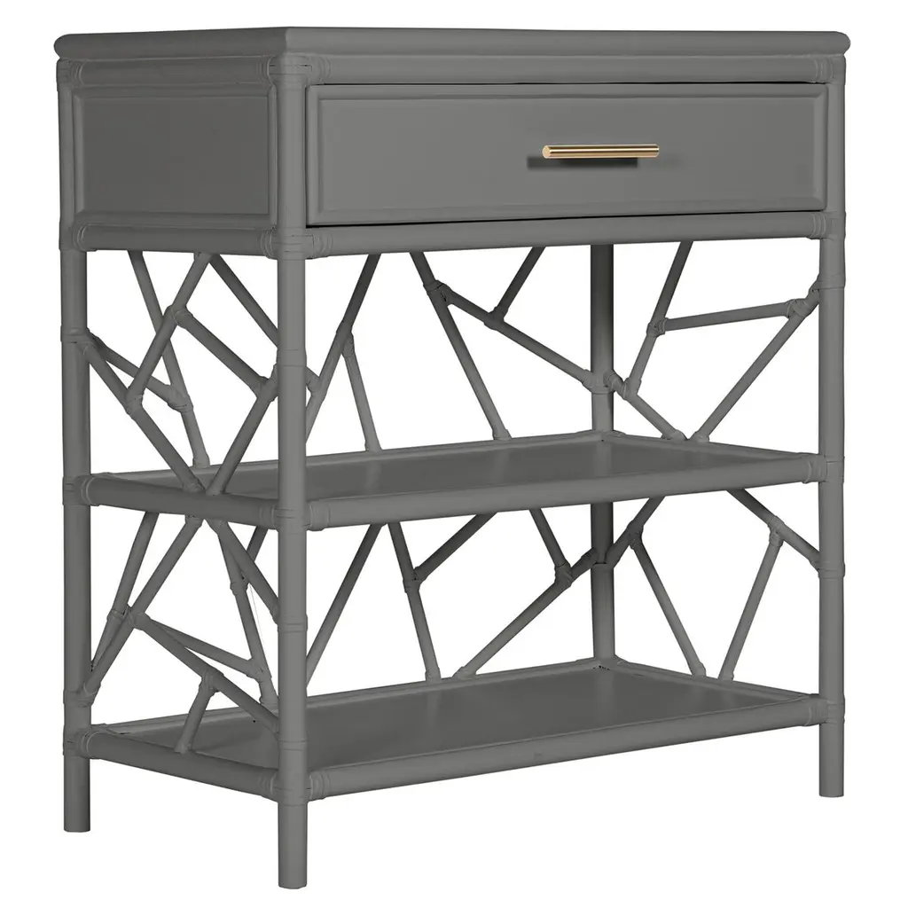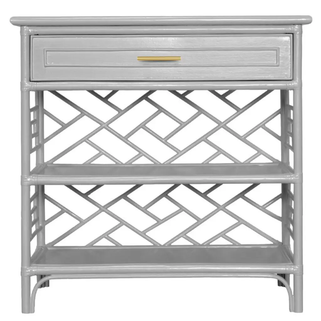 Showcasing hand-arched circular fretwork and a light gray finish, this side table is crafted of rattan with rawhide bindings for added strength and textural contrast. Its two wooden shelves and single drawer offer a wealth of storage space. An anti-tip kit is included to secure this piece to the wall and prevent tipping.