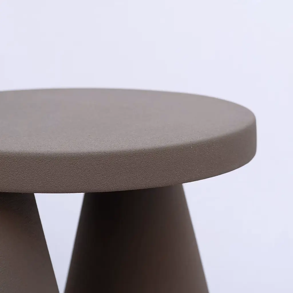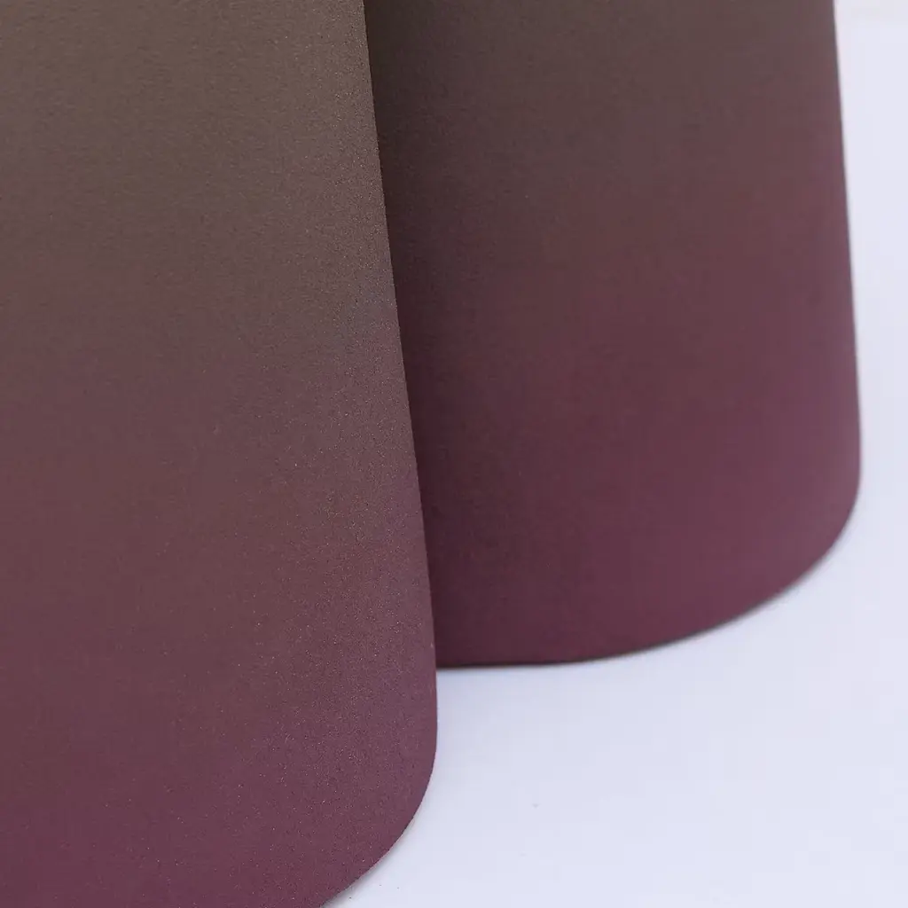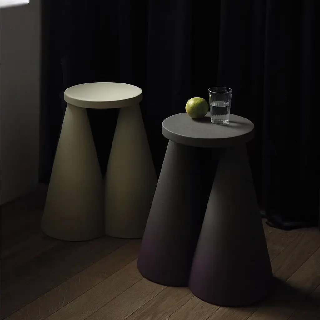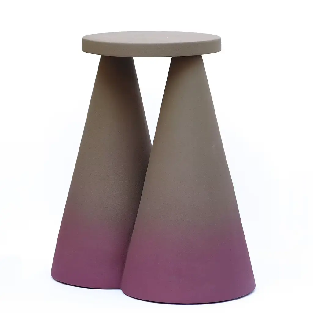 Designed by Cara/Davide, the Isola Table figuratively refers to an island ("isola" in Italian) but is a metaphor for the isolation experienced during the Covid-19 pandemic, seen not only as a negative condition but also as a place of emotional and physical refuge. The strong geometric silhouette is crafted entirely of ceramic with two imposing cones forming the base and a small round top. Suitable for indoor use only, this unique piece is finished in purple with green undertones with a gradient effect that enhances its evocative sculptural image. Bespoke colors are available upon request.