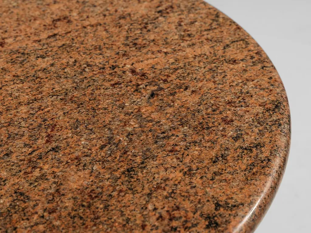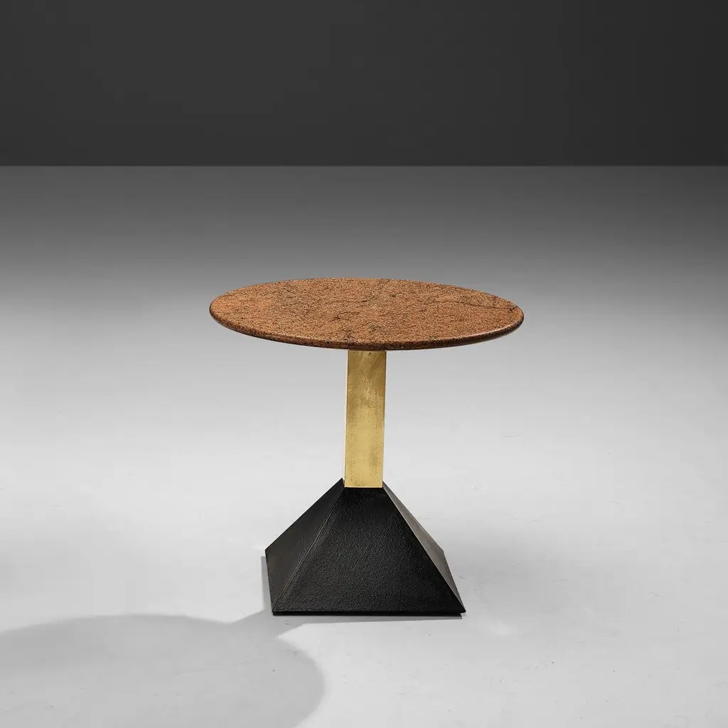 Side table, granite, metal, brass, Italy, 1980sThis side table features a red granite tabletop in round format. The granite shows a vivid surface. A brass pedestal ends in a black trapezoid base in metal. The composition of textures and shapes, results in a nicely looking coffee or side table with typical traits of Italian design. As we currently have a large amount of these side tables in our collection, this model is a great choice to furnish a sizeable space, for example a lobby, dining area, conference room or a café.Please note that we have a larger number of these tables and similar shapes available in our current stock. This item is in used condition.