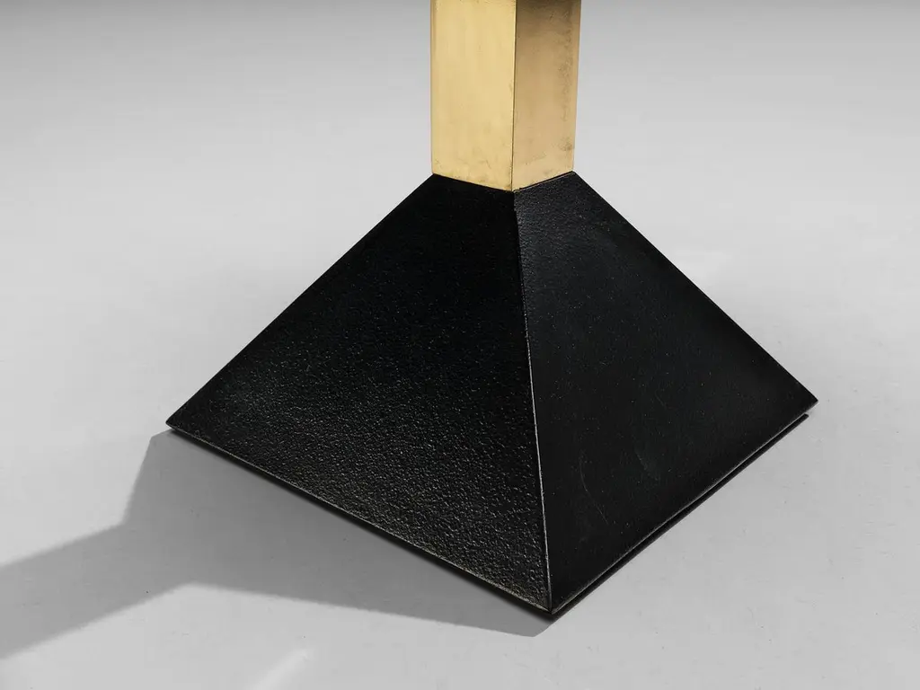 Side tables, granite, metal, brass, Italy, 1980sThese side tables feature a red granite tabletop in round format. The granite shows a vivid surface. A brass pedestal ends in a black trapezoid base in metal. The composition of textures and shapes, results in a nicely looking pair of coffee or side tables with typical traits of Italian design. As we currently have a large amount of these side tables in our collection, this model is a great choice to furnish a sizeable space, for example a lobby, dining area, conference room or a café.Please note that we have a larger number of these tables and similar shapes available in our current stock. This item is in used condition. The listed price, is the price per item.