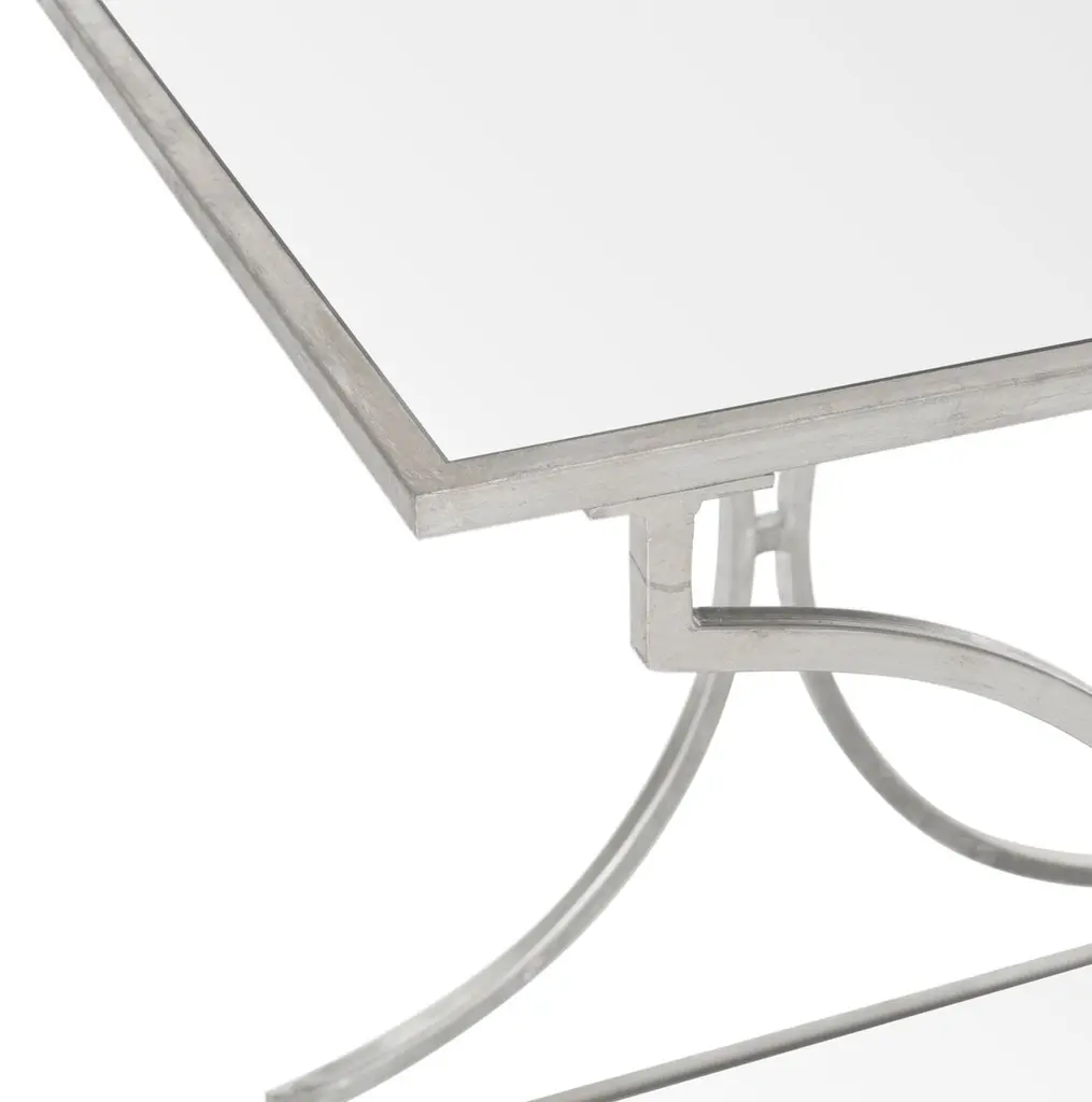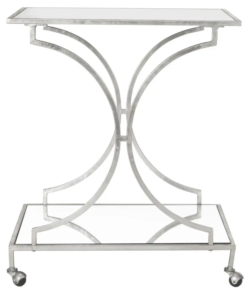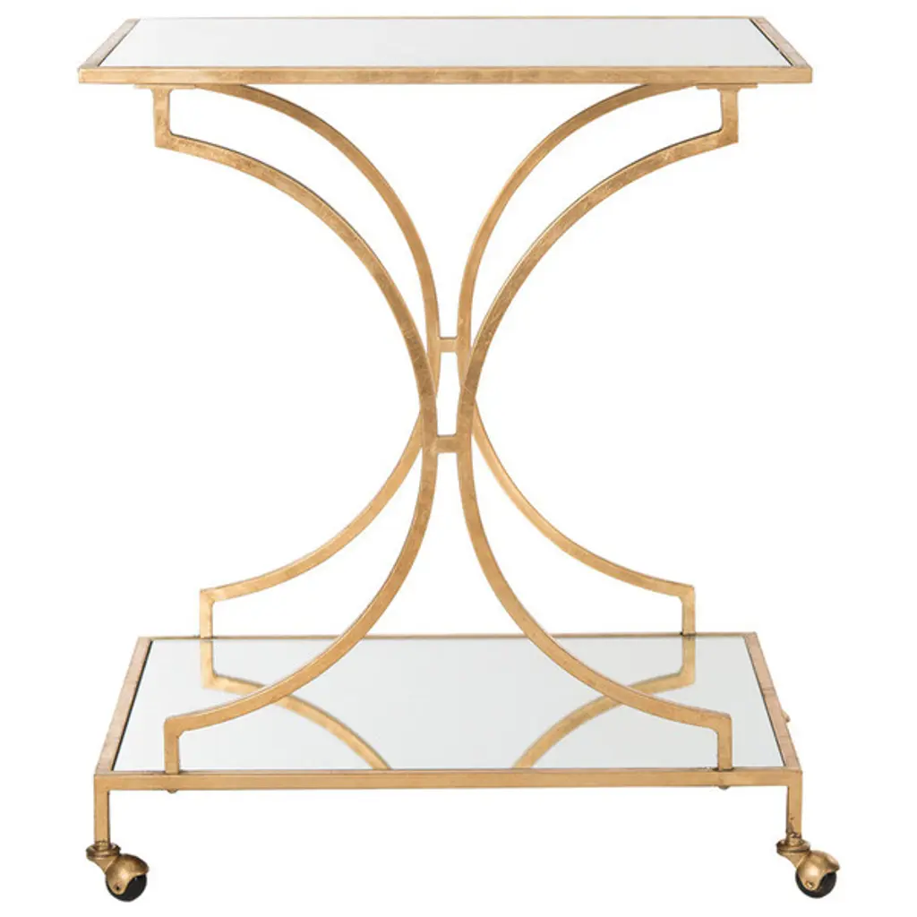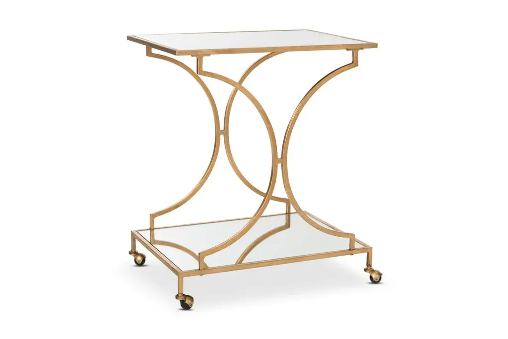 Pretty enough to be a living room side table, this portable bar cart is brimming with old world luxury. With mirrored glass shelves and a beautifully forged iron base, this cart is ready for dessert or beverage service.