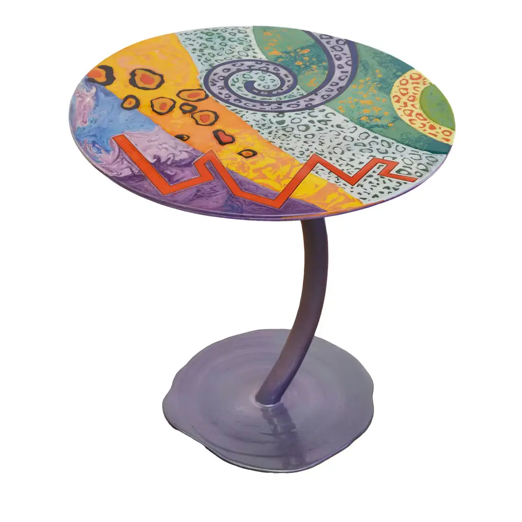 This stunning object of functional decor is a postmodernist column that can be used as a tall side table or end table, or as a striking addition to a contemporary living room to showcase a work of art or other collectibles. This design by Ettore Sottsass was created in 1984 and is crafted of plastic laminate. The zigzag elements lining the round base up to the round glass top boast an eclectic combination of patterns and colors and will enliven any room in the house.