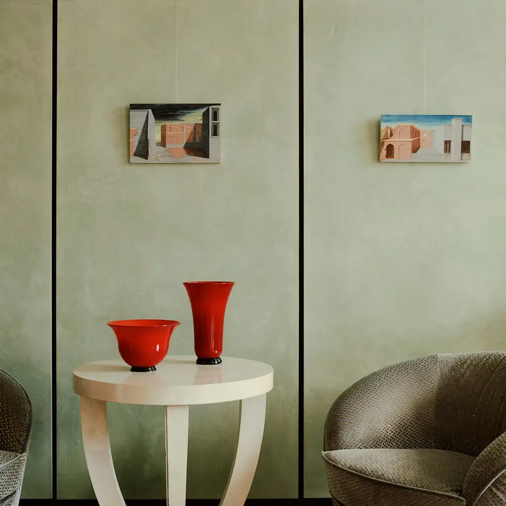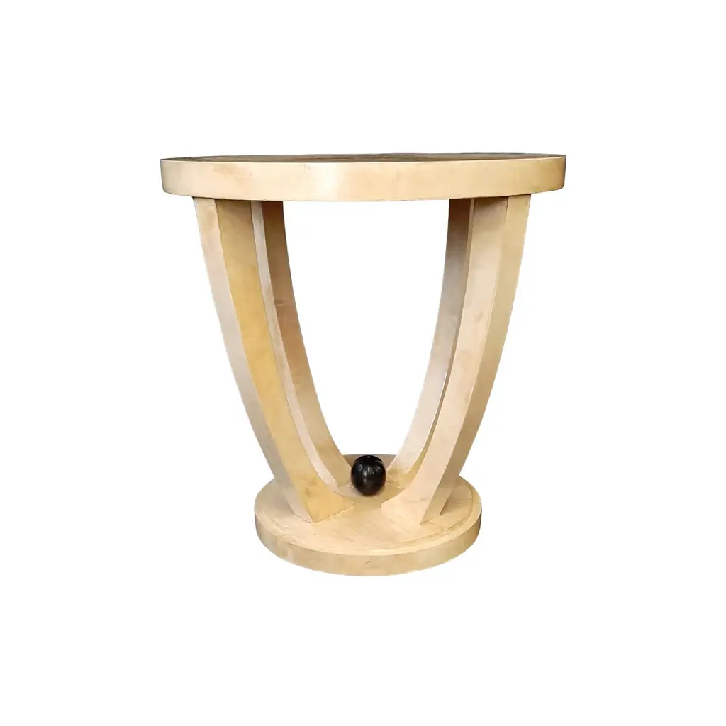 The singular aesthetic defining this round side table is thanks to its precious natural ivory parchment upholstery, which enables the piece to further upgrade its flair over time. Four legs curving outwards connect the base to the round top, the predilection for curves confirmed by the decorative sphere lacquered in glossy black that gently accents the base. This piece is sure to bring utmost sophistication into any modern or eclectic decor.