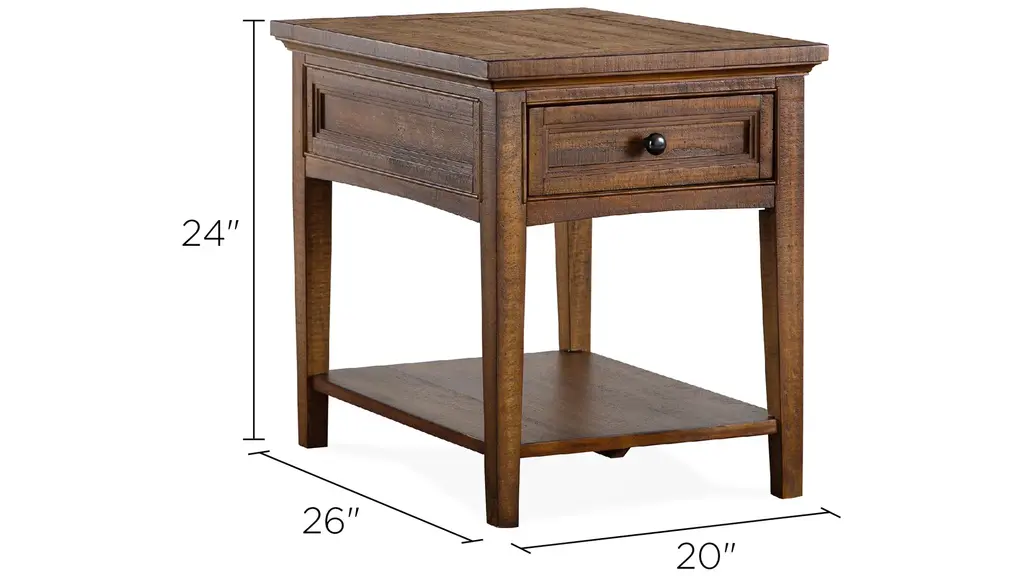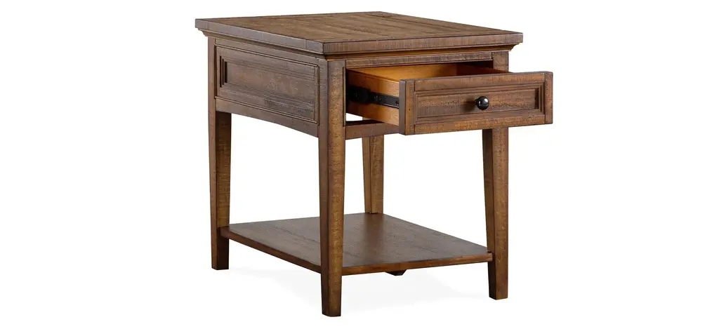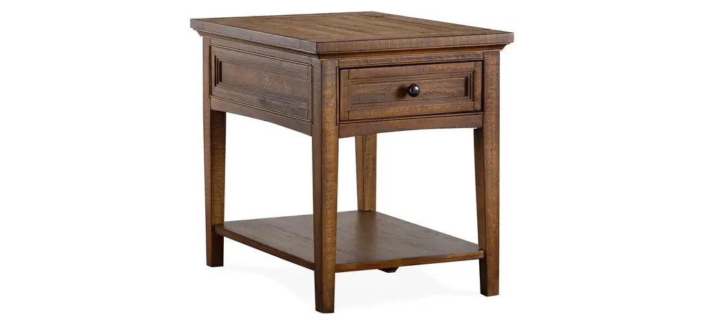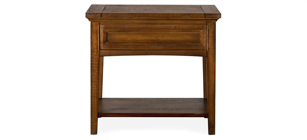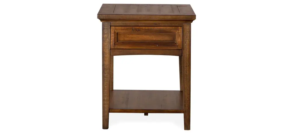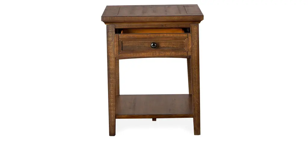 Welcome home to classic styling with the timeless Ivy Ridge end table. Its easygoing style comes to life in an alluring toasted nutmeg finish accented with stunning aged bronze hardware. Offering storage options-both open and hidden-this table makes it easy to keep your living space tidy and organized. With handsome detailing and thoughtful features, Ivy Ridge end table makes creating a beautiful home a breeze.