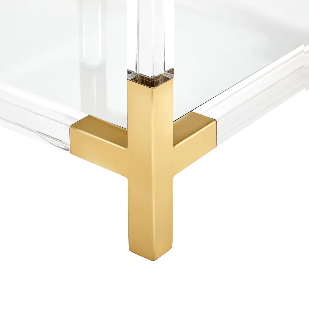 Clearly Cool. Our Jacques Collection is the perfect blend of simplicity and glamour, modern and traditional. In luxe clear acrylic with brushed brass accents, this petite cube is perfect next to your sofa, by your bed, or saddled up next to your favorite chair. The second shelf gives you plenty of space for storage and styling your favorite books and baubles. Big presence, weightlessly transparent.