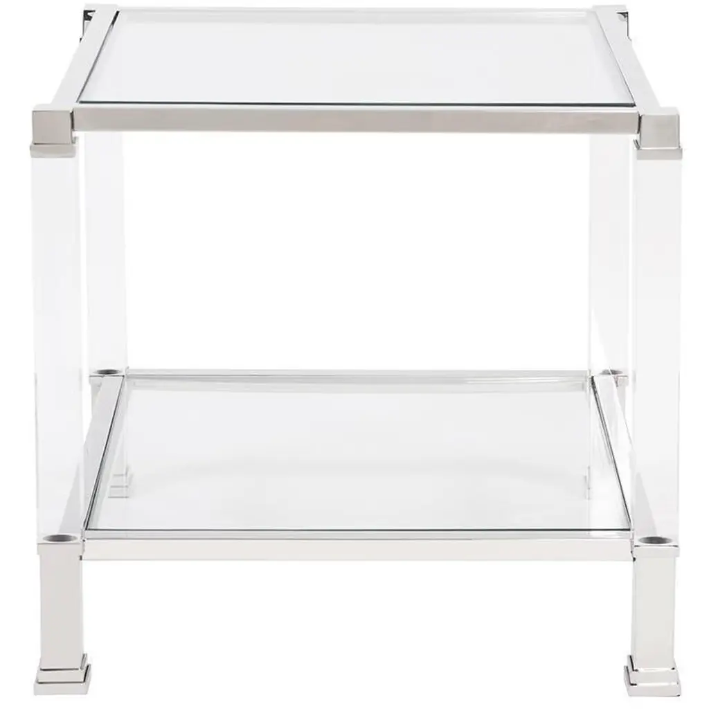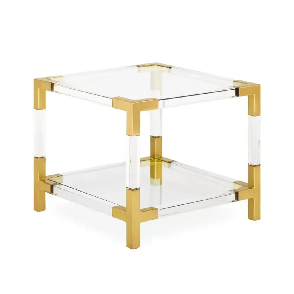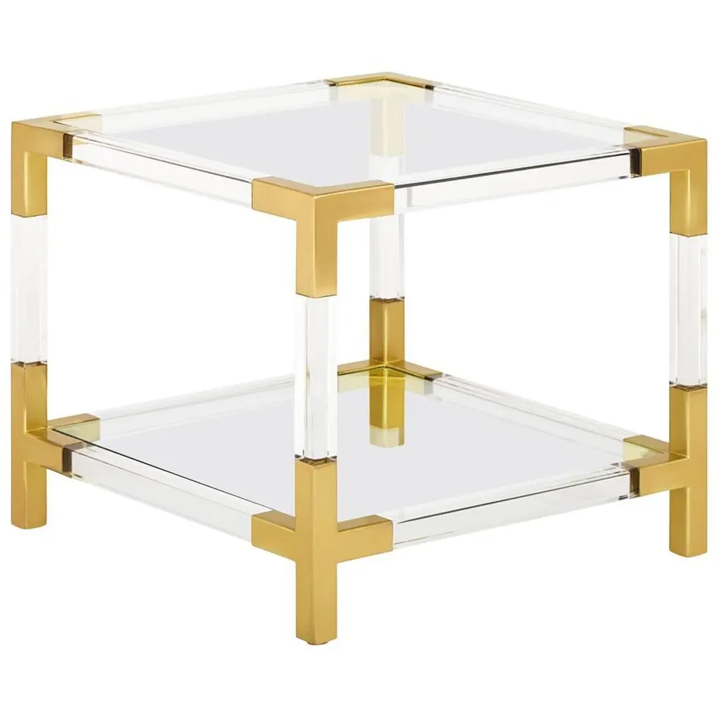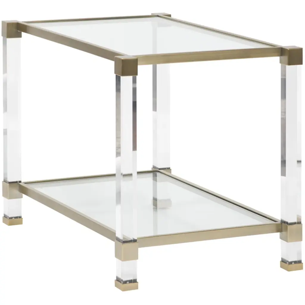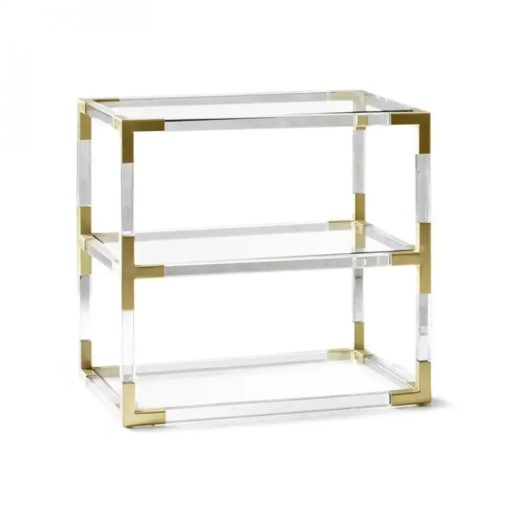Clearly Cool. At 26" high, our Jacques Two-Tier Side Table is the perfect complement for any high-armed sofa, and it doubles delightfully as a chic nightstand. Luxe clear acrylic, warm brass accents, and a simple silhouette is the perfect blend of simplicity and glamour, modern and traditional—put it to work in endless interiors, from minimalist to maxilmalist. Big presence, weightlessly transparent.