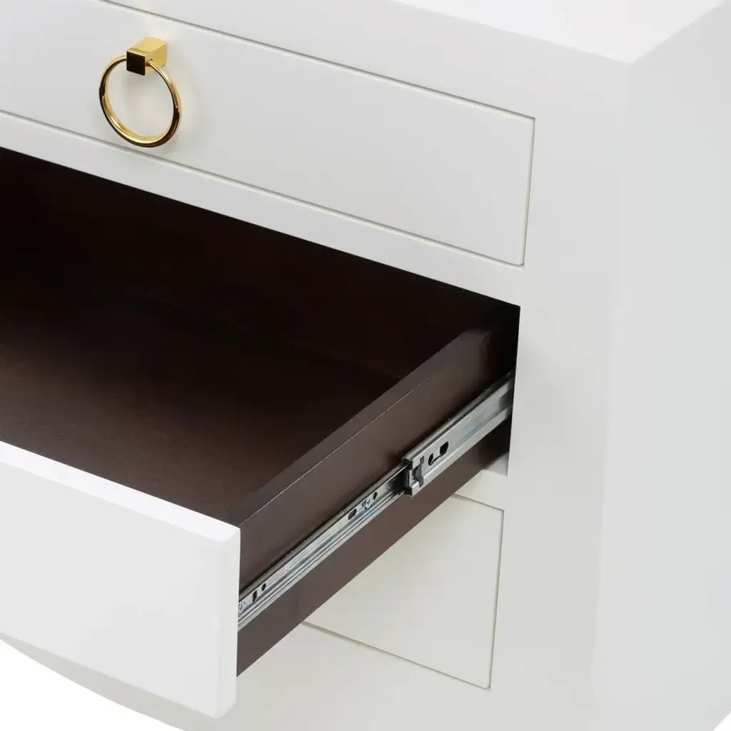 Fun, fresh, and a little bit funky, Villa & House's charismatic Jacqui Collection upgrades a room with glamorous flourish. A modern embodiment of opulent Hollywood Regency design, our Jacqui 3-Drawer Side Table features decorative wood-cut detailing, Chow-style curved feet, and subtly graduated drawers topped with glittering gold ring pulls. Realized in lacquered wood with a chic white finish and softly burnished shine, the expertly-crafted piece is sure to play a starring role in any atmosphere, from traditional decor schemes to the more eclectic. Whether flanking a sofa or California King bed, the Jacqui's presence instantly whisks you away to a scene straight out of classic Hollywood.