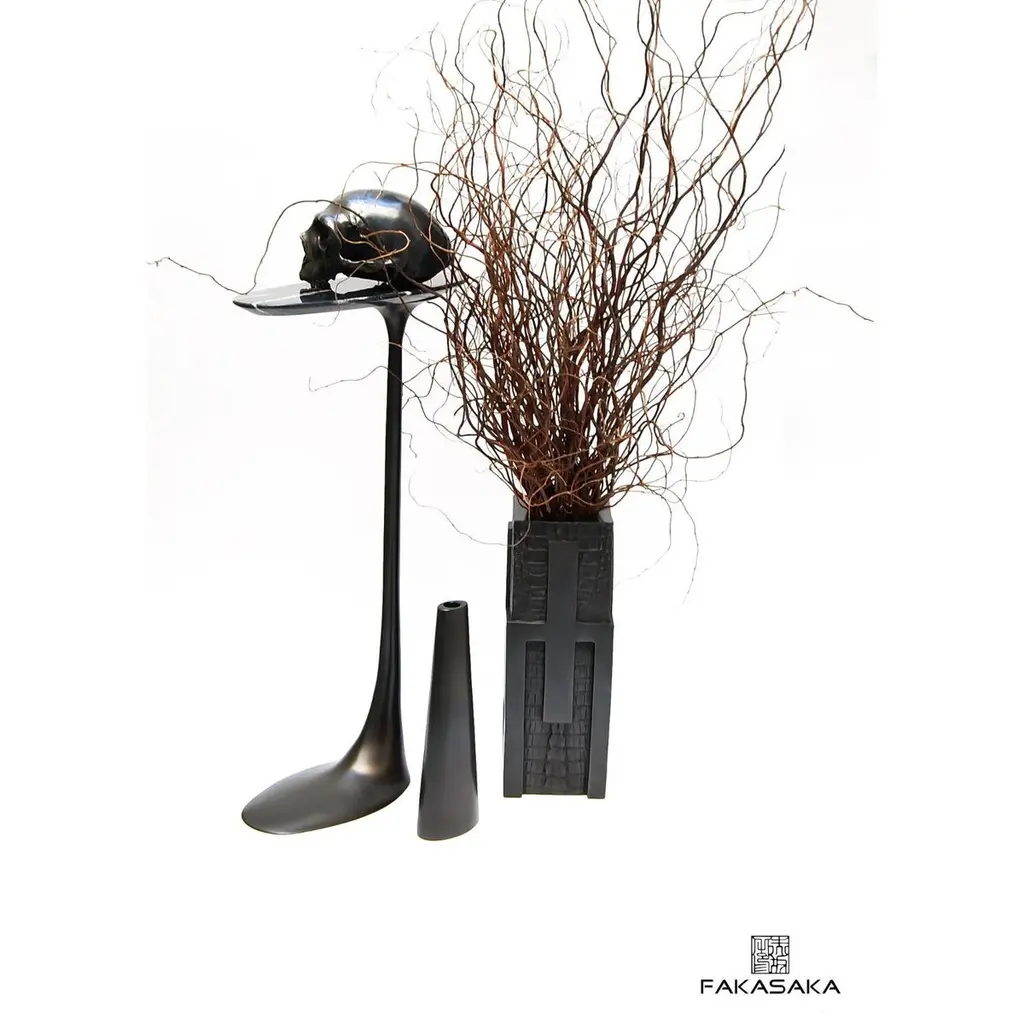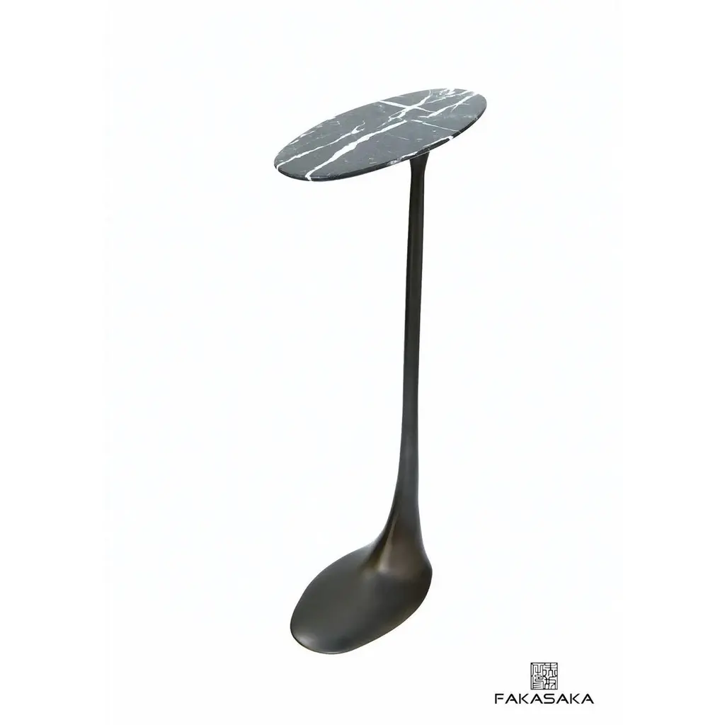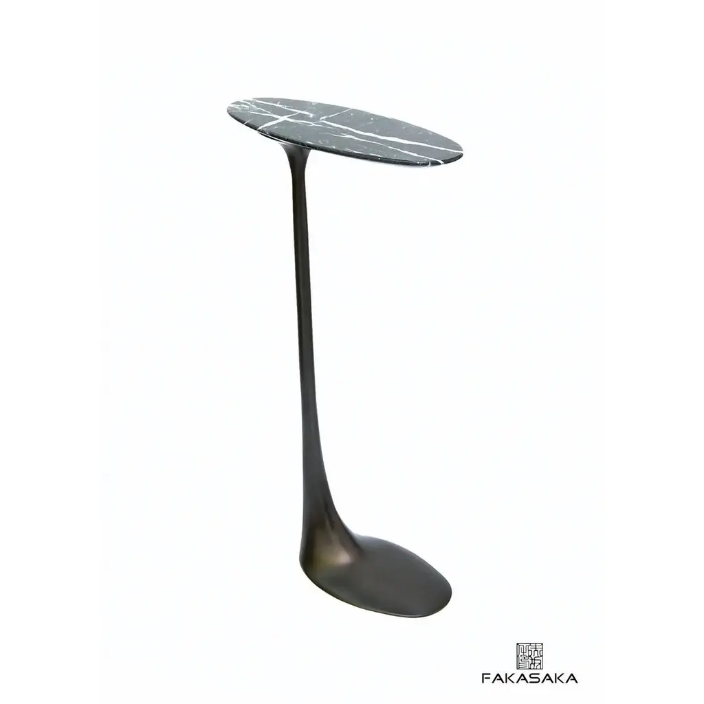 Jagger drink table with Nero Marquina marble top by Fakasaka Design.Dimensions: W 18 cm D 38 cm H 62 cm.Materials: dark bronze base, Nero Marquina marble top.Also available in polished bronze. FAKASAKA is a design company focused on production of high-end furniture, lighting, decorative objects, jewels, and accessories. Established in 2007, Fakasaka is the eponymous design company by Brazilian artist Fernando Akasaka distinguished by a penchant for producing intricate detailed cast bronze collectible design objects, furniture and jewelries. Fakasaka explores the contrast between the manmade and the natural through shapes and finishes that create a clear aesthetic. The constant challenge to balance elements is met with an outcome that is a striking assortment of bronze furniture and objects in oxidised and polished finishes, accented with precious regional stones, granites and rich prehistoric reptilian motifs.
