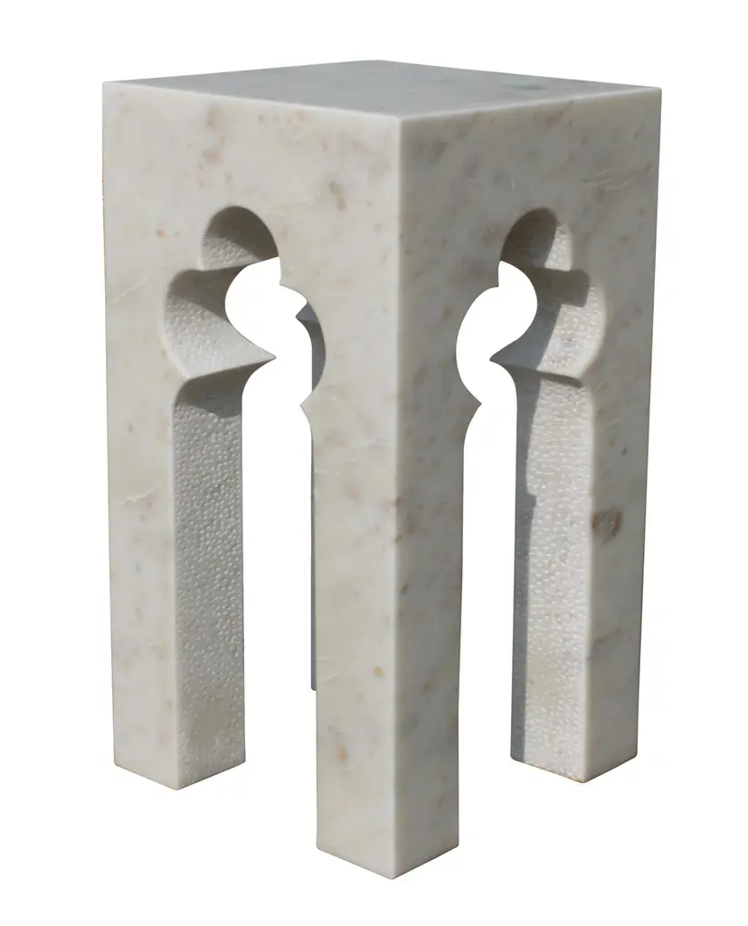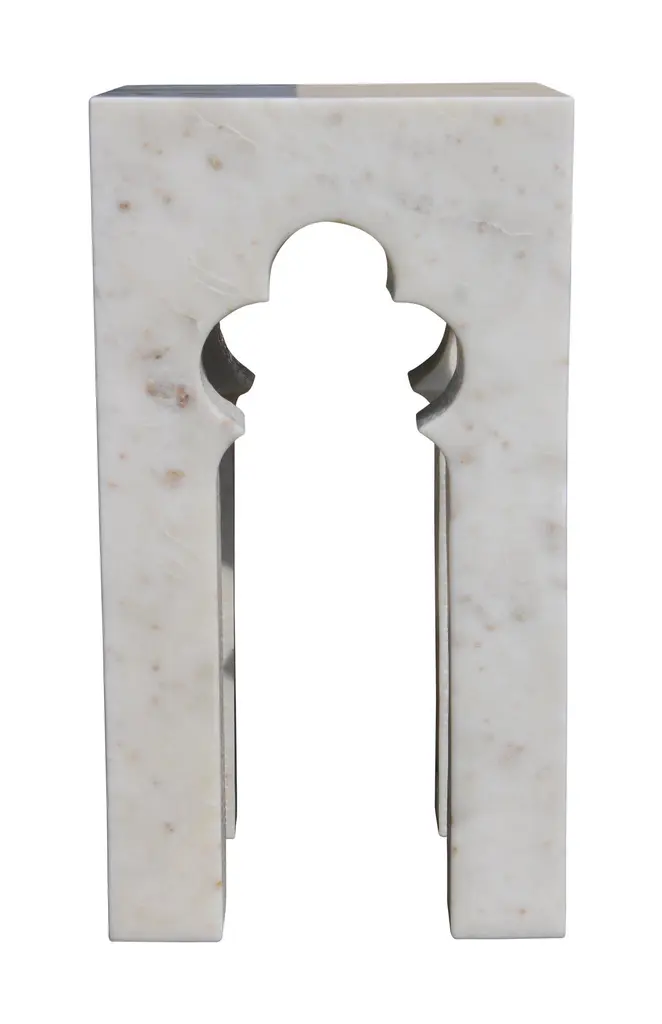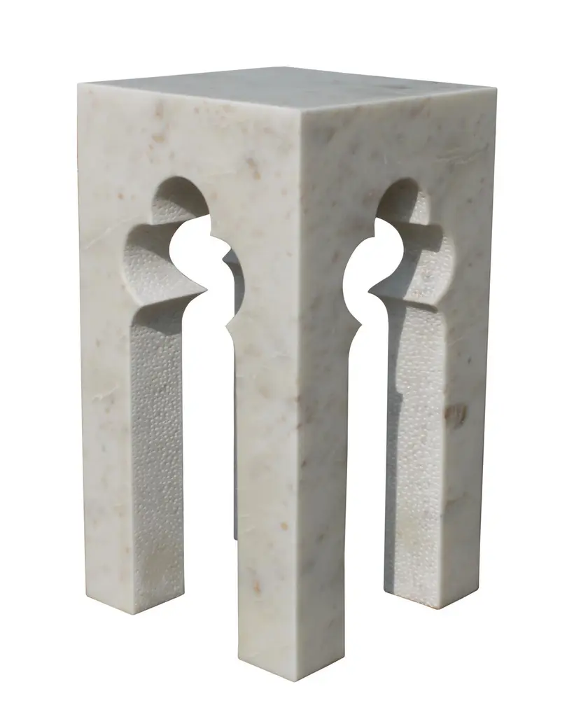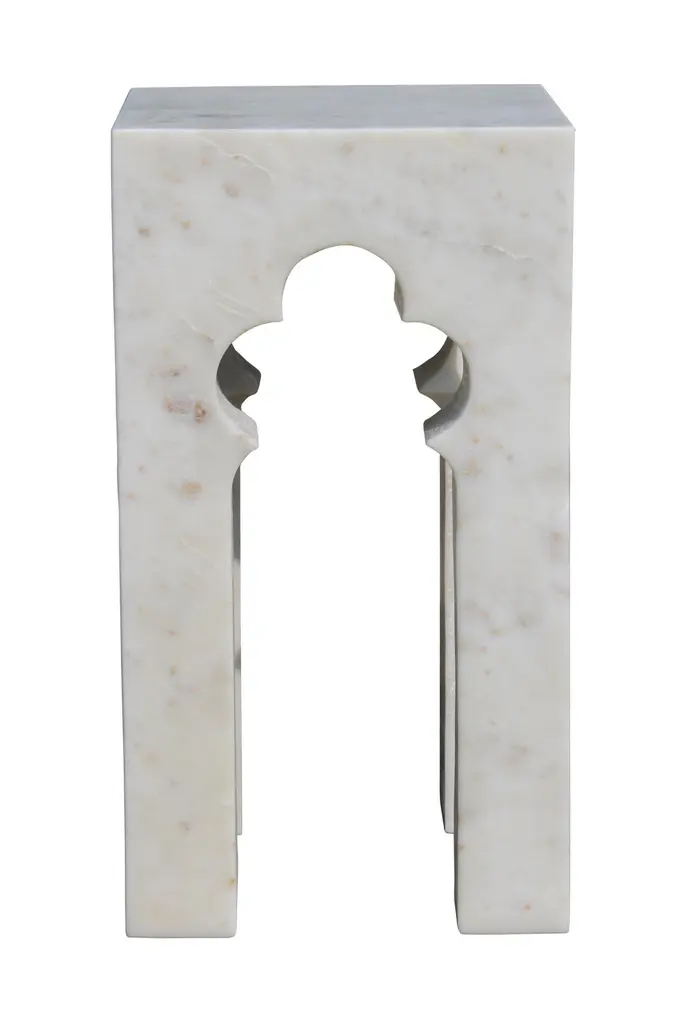 Inspired by the elegant architectural element, namely the mehrabs, he saw in the palaces of Mughal India, the renowned designer Paul Mathieu has created this unique hand-carved side table. Solid blocks of marble are hand-carved into low elegant tables before they are polished by hand. The contrast between the elegant inline of the mehrab with the clean and solid outline is the most striking feature of this design. Jahangir side table in White Marble Size- 12" x 12" x 21.7" HMaterials - White marble, hand-carvedBuyer cancellation-The cancellation charge is 25% which increases to 50% if the production is started.Prices do not include shipping from India (for custom orders) or our MN warehouse (items from stock). That will be additional.