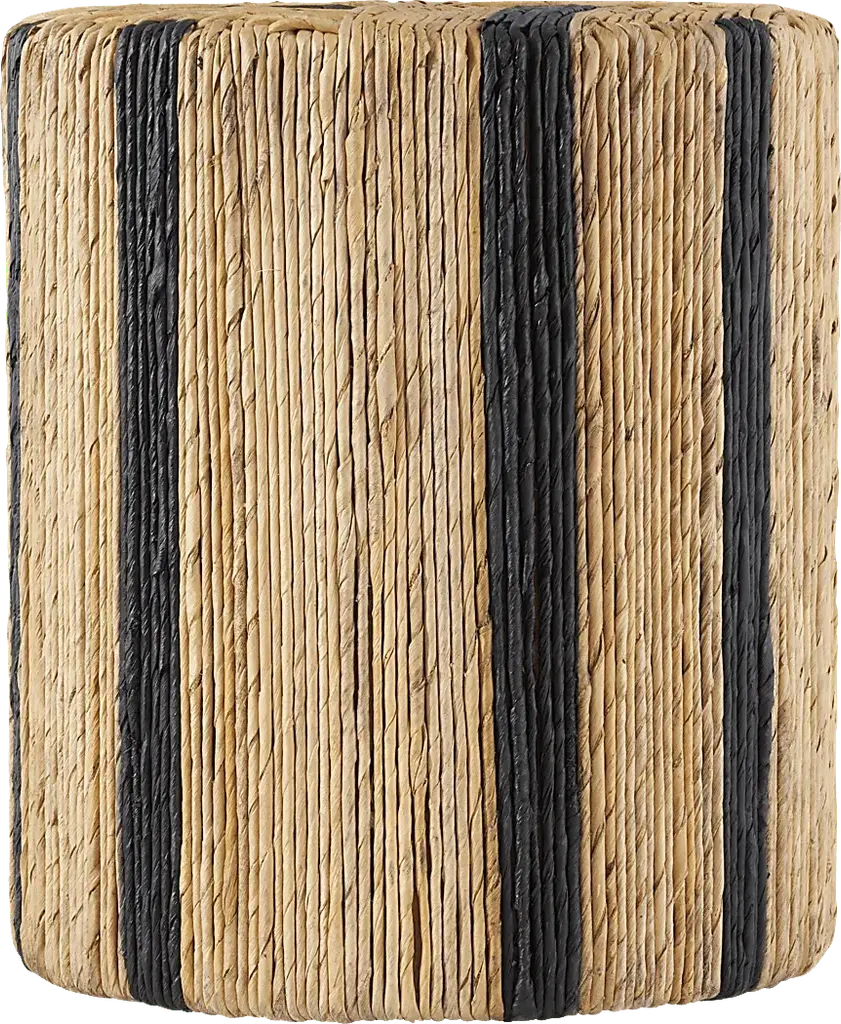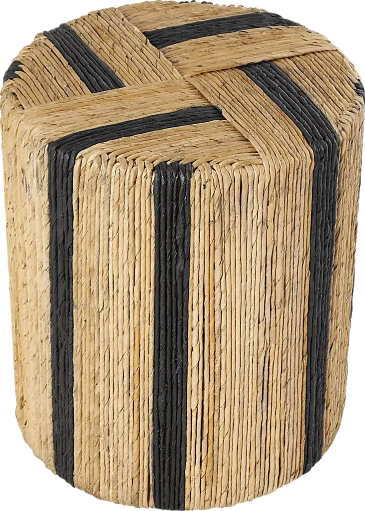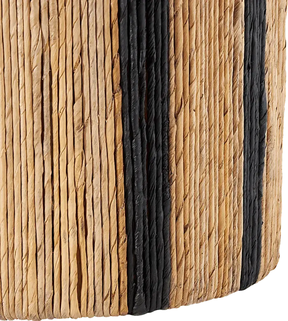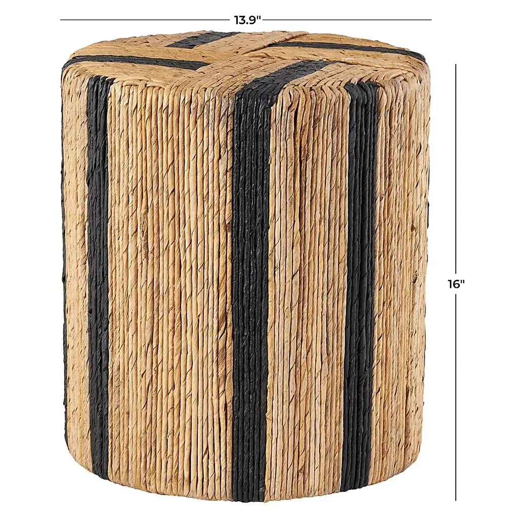 Introducing the Jahfi accent table. Designed with a free-spirited charm where vibrant hues, eye-catching patterns, and whimsical accents transform your space and showcase your personality. Crafted from banana leaf fibers over a durable mahogany wood frame, the brown side end accent table offers a natural and lasting design. The round table stands out with its textured brown exterior, adorned with navy blue stripes that add a unique touch to its finish. The banana leaf accent table features an eye-catching bohemian design that adds character and warmth to any interior space. Customer assembly is required.