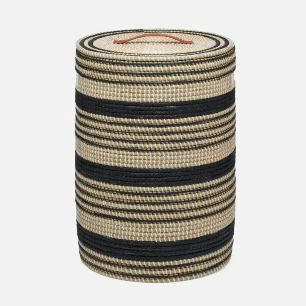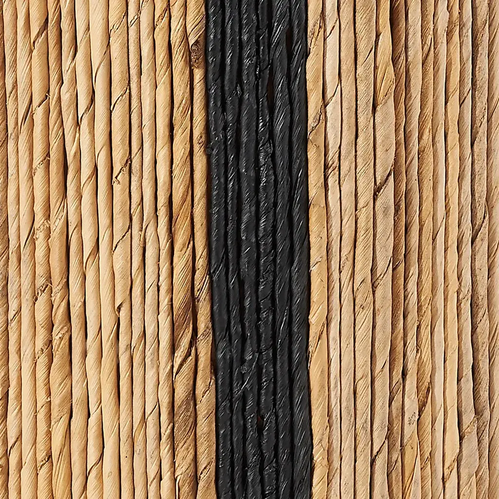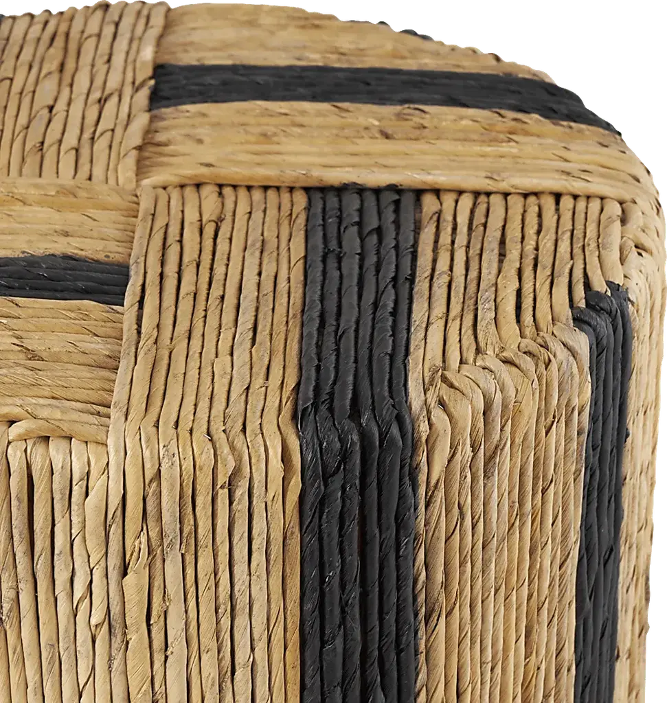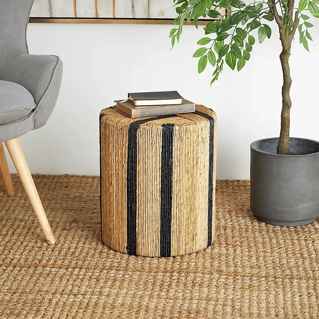 Introducing the Jahfi accent table. Designed with a free-spirited charm where vibrant hues, eye-catching patterns, and whimsical accents transform your space and showcase your personality. Crafted from banana leaf fibers over a durable mahogany wood frame, the brown side end accent table offers a natural and lasting design. The round table stands out with its textured brown exterior, adorned with navy blue stripes that add a unique touch to its finish. The banana leaf accent table features an eye-catching bohemian design that adds character and warmth to any interior space. Customer assembly is required.