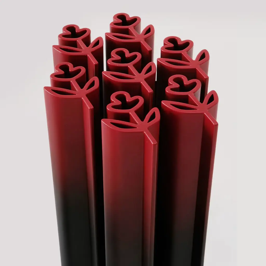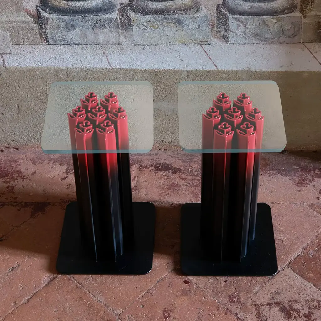 The Jaipur Garden side table with glass features a distinctive base composed of metal extrusions shaped into floral motifs that evoke ethnic and folk design elements. This piece merges artistic expression with a structural, almost industrial aesthetic, supporting a transparent glass top that enhances its sculptural quality. Its compact size makes it suitable for versatile placement within modern interiors.