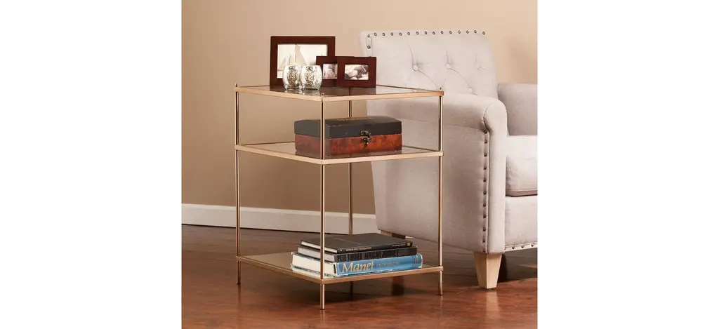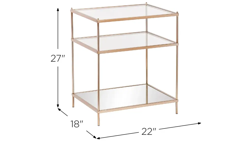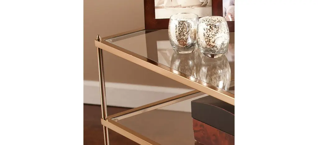 Bring the roaring '20s to life with this Jameson Side Table. The minimalist architecture contrasts with the luxurious, metallic gold frame, high shine mirrored shelf, and sleek glass tabletop to create a vision a la Gatsby. Use the shelves tre your oh-so-gorgeous tchotchkes and/or art deco lamp; make a stunning statement anywhere in your home with this glamorous accent table.