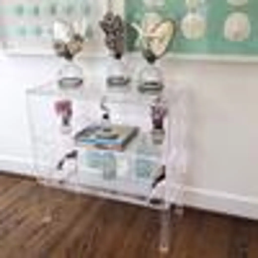 The Illusion acrylic side table by Jamie Dietrich Designs is as versatile as it is glamorous. Taking up minimal visual space, this piece works well in a living room, entryway, or home office. Large : 60" W x 14" D x 30" H 9" between shelves Materials: Acrylic, Special Order - Please allow 4-6 weeks. Made in the USA Free shipping