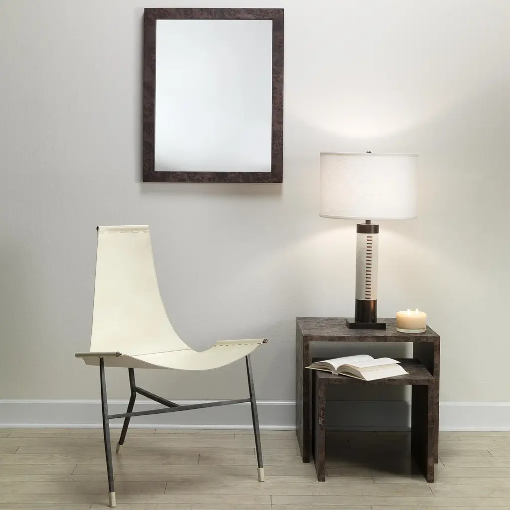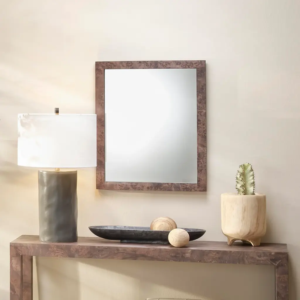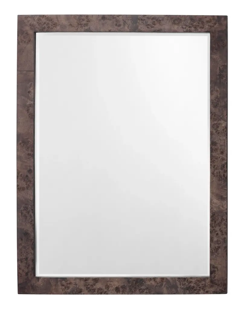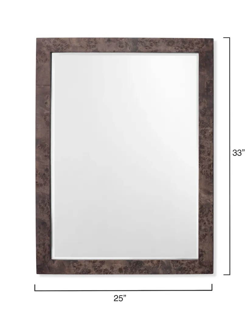 The clean, classic lines this rectangular mirror make it a versatile statement to any room. The burnished beauty of its burl wood veneer frame reveals one-of-a-kind variations in tone and pattern. Hang horizontally or vertically over a console, side table or desk for a timeless touch. Hand-made of Burl Wood Veneer Beveled glass mirror Mirror can hang vertical or horizontal One-of-a-kind variations in tone and pattern The handcrafted nature of burl wood creates products with character and individuality. The inherent knots, grains, and variations in tone and texture are preserved, to create pieces rich in detail and natural beauty. These unique imperfections and variations are what define our products, with each piece having its own personality. Mirror Surface: 29"H x 21W" D-Loop Hanging Mechanism Frame: 2"W MDF Backing Care Instructions: Wipe frame with a soft, dry cloth. Wipe glass with standard glass cleaner. DO NOT use cleaners or abrasives on mirror frame.