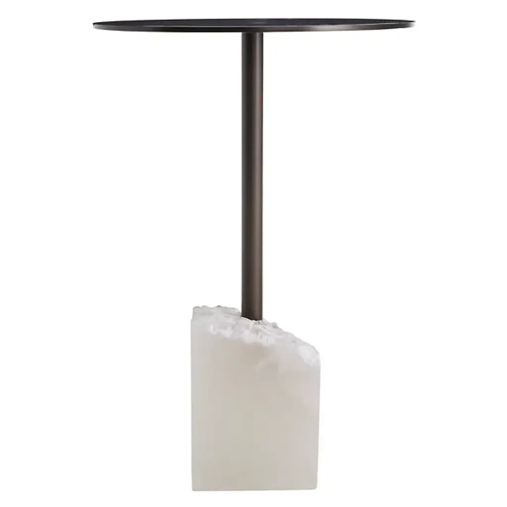 Grippy texture and dashing lines underscore the dramatic combination of shapes in the sculptural Jane Accent Table from Arteriors. This piece showcases the beautiful touch of mother nature and skilled artisans with a roughly cut alabaster base. Rich veining in soft tones coarse through the alabaster, displaying a distinct visual to everyone around the room. The jagged top of the alabaster impresses against the smooth, contrasting metal column. A low-profile tabletop holds one's objects with a floating look.