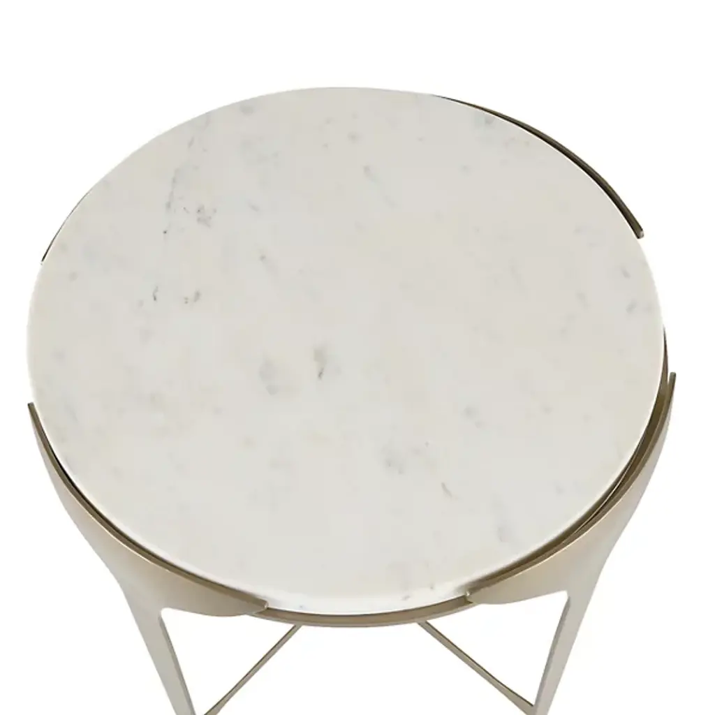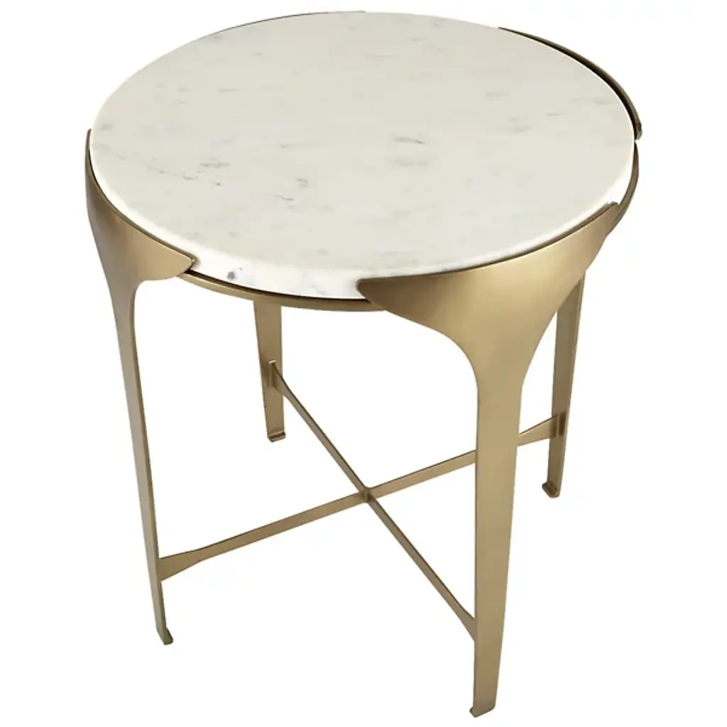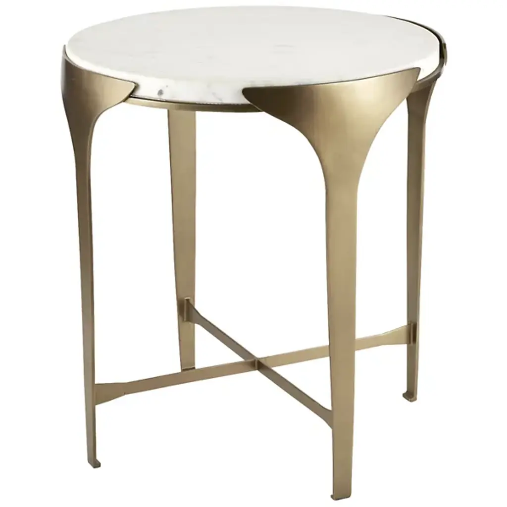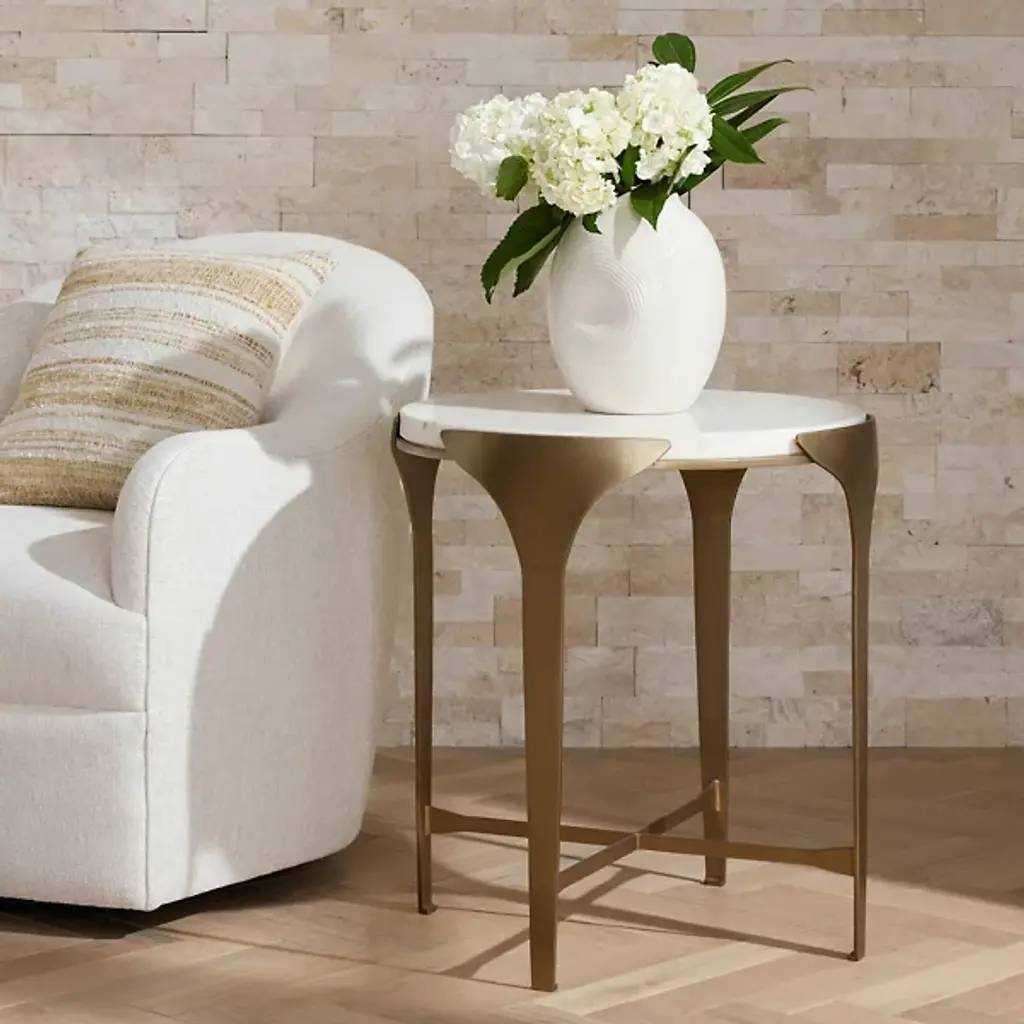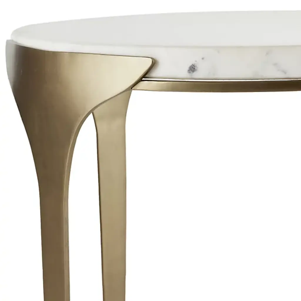 The Janine End Table from Arteriors, a refined companion to our Janine console, exudes minimalist elegance with subtle design details. Inspired by the Art Deco period, its slender antique brass-plated iron frame gently flares upward, creating a sophisticated silhouette. The white marble top, seemingly floating within its support, adds a touch of luxurious contrast. Each piece features unique variations in finish, ensuring it blends seamlessly into any space while making a distinctive statement of style and craftsmanship.