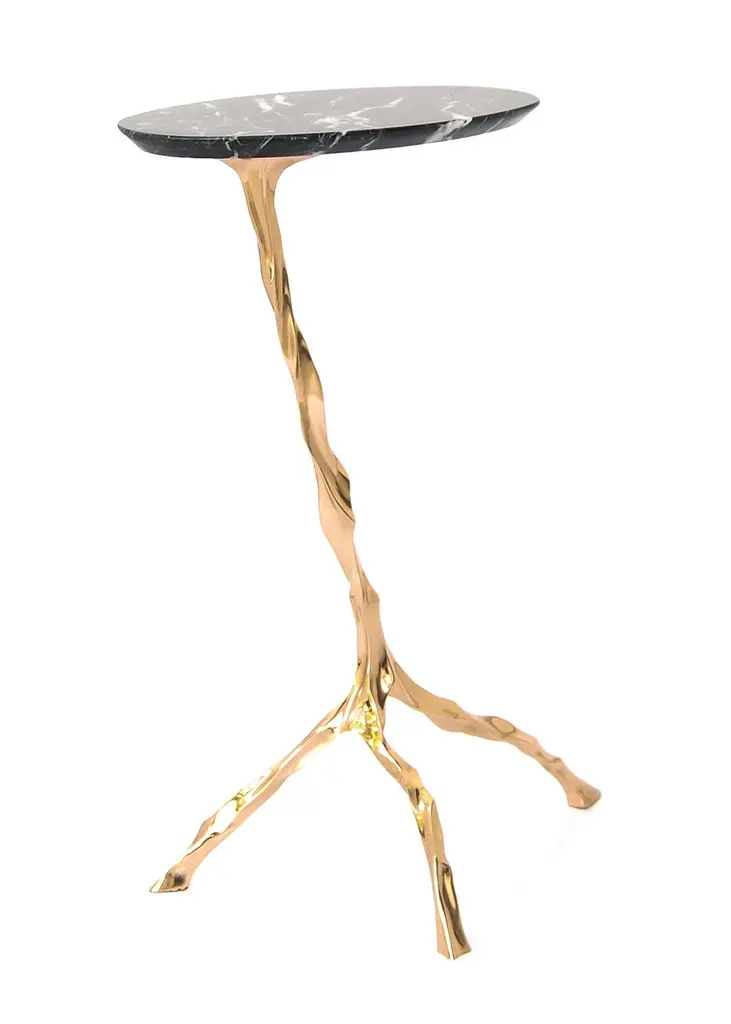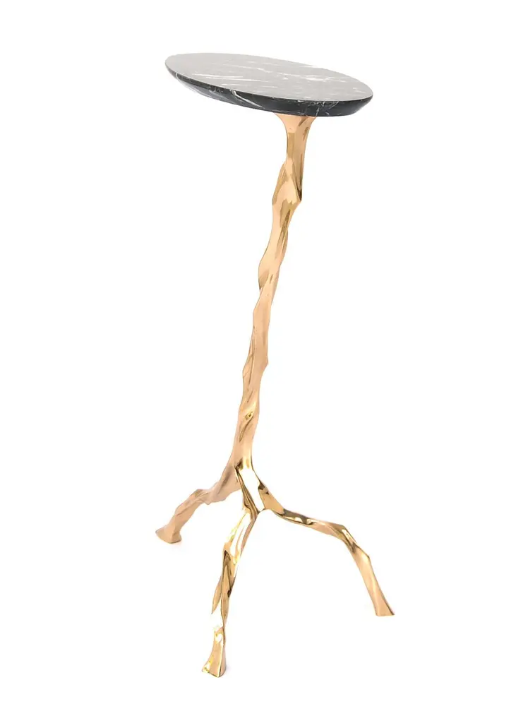 Janis drink table with Nero Marquina marble top by Fakasaka Design.Dimensions: W 28 cm, D 50 cm, H 62 cm.Materials: polished bronze base, Nero Marquina Marble top. Also available in different table top materials (Translucent Onyx top or dark bronze base)). FAKASAKA is a design company focused on production of high-end furniture, lighting, decorative objects, jewels, and accessories. Established in 2007, Fakasaka is the eponymous design company by Brazilian artist Fernando Akasaka distinguished by a penchant for producing intricate detailed cast bronze collectible design objects, furniture and jewelries. Fakasaka explores the contrast between the manmade and the natural through shapes and finishes that create a clear aesthetic. The constant challenge to balance elements is met with an outcome that is a striking assortment of bronze furniture and objects in oxidised and polished finishes, accented with precious regional stones, granites and rich prehistoric reptilian motifs.