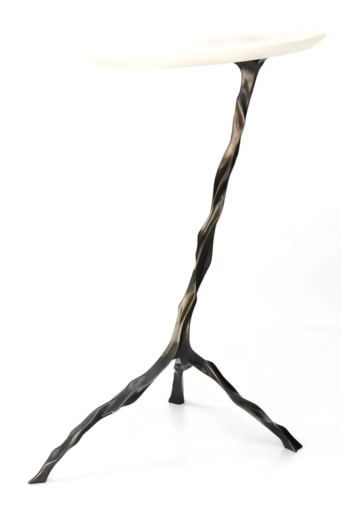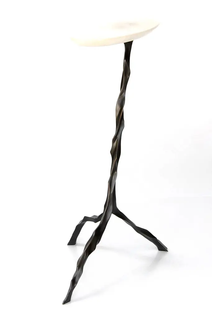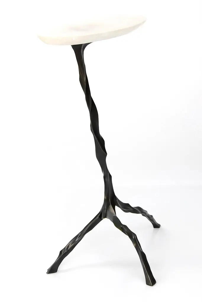 Janis drink table with onyx top by Fakasaka DesignDimensions: W 28 cm, D 50 cm, H 62 cm.Materials: dark bronze base, translucent onyx top. Also available in different table top materials (Dark bronze base, Nero Marquina Marble top). FAKASAKA is a design company focused on production of high-end furniture, lighting, decorative objects, jewels, and accessories. Established in 2007, Fakasaka is the eponymous design company by Brazilian artist Fernando Akasaka distinguished by a penchant for producing intricate detailed cast bronze collectible design objects, furniture and jewelries. Fakasaka explores the contrast between the manmade and the natural through shapes and finishes that create a clear aesthetic. The constant challenge to balance elements is met with an outcome that is a striking assortment of bronze furniture and objects in oxidised and polished finishes, accented with precious regional stones, granites and rich prehistoric reptilian motifs.