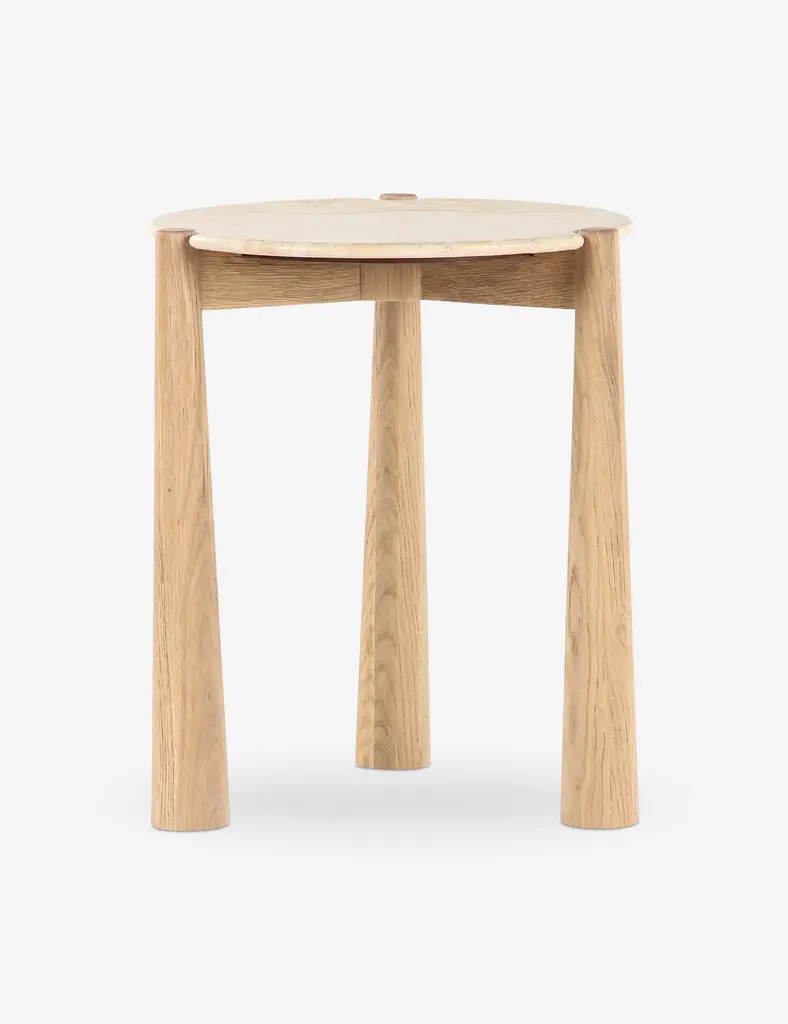 Three tapered oak legs define this small side table's chic silhouette, featuring a round travertine top for that grounding touch of stone beside your seat. It's the perfect end table for a space where natural elements and textures set off an artfully modern edit.