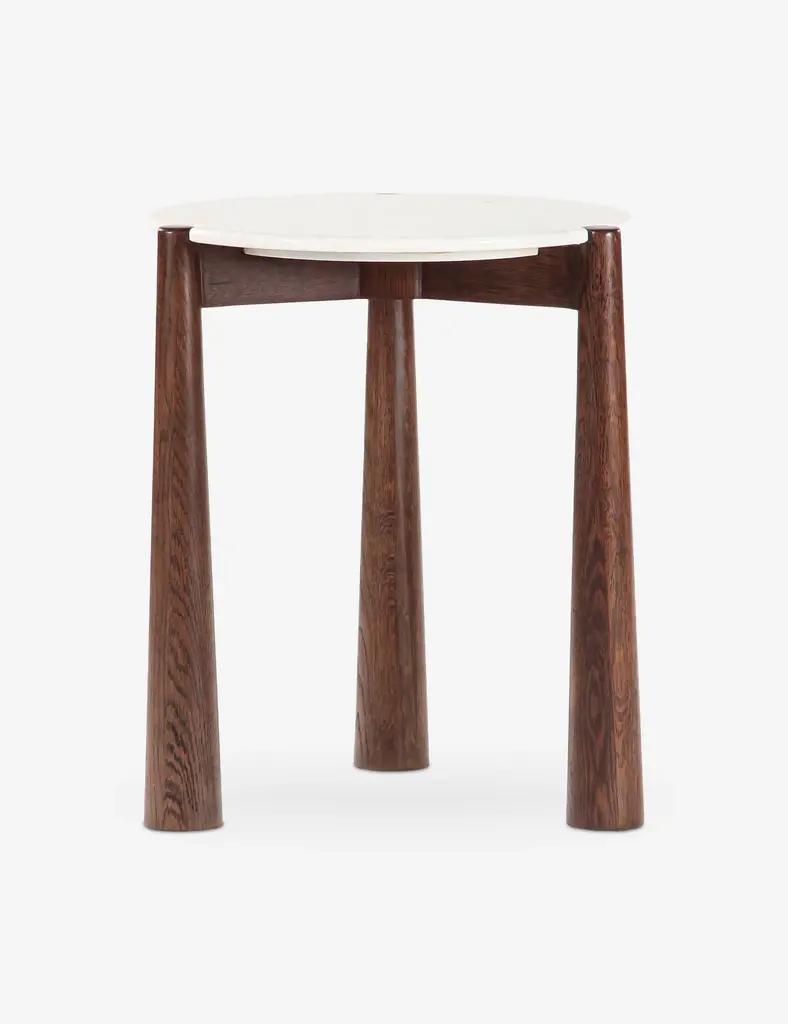Three tapered oak legs define this small side table's chic silhouette, featuring a round travertine top for that grounding touch of stone beside your seat. It's the perfect end table for a space where natural elements and textures set off an artfully modern edit.
