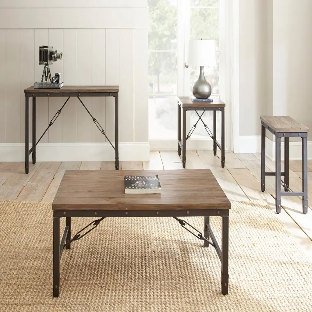 Make it industrial with the rustic Jersey Occasional Collection from Steve Silver Company. Table tops feature a vintage plank-effect finished in a a warm antiqued tobacco stain that blands effortlessly with the iron metal base. The metal top rail features a rivet look that works beautifully with the under-top stretchers. Choose from Cocktail or End Table or get both!Constructed of pine veneers, engineered hardwoods and iron base in an antiqued tobacco finishCan be used as a Side Table or Nightstand, with the 24in height working especially well for low profile bedsStyling details include simulated plank top, riveted iron sides and industrial styled under-top stretchers