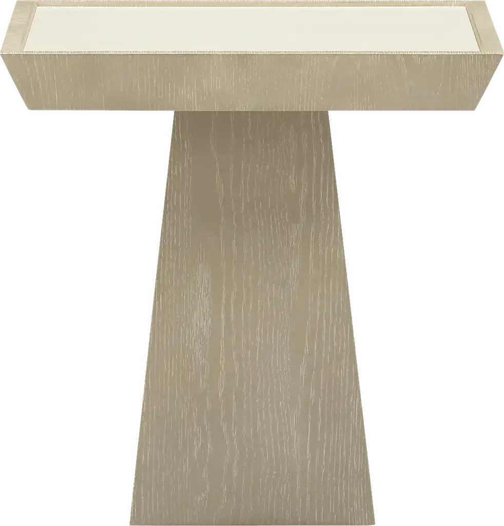 A study in contrast and precision, the Jetweels brown end table brings crisp geometry and calming texture to your space. The creamy top sits above a gray-brown ash veneer base with tapered angles and sharp lines, while cerused grain adds a soft finish that feels grounded and refined.
