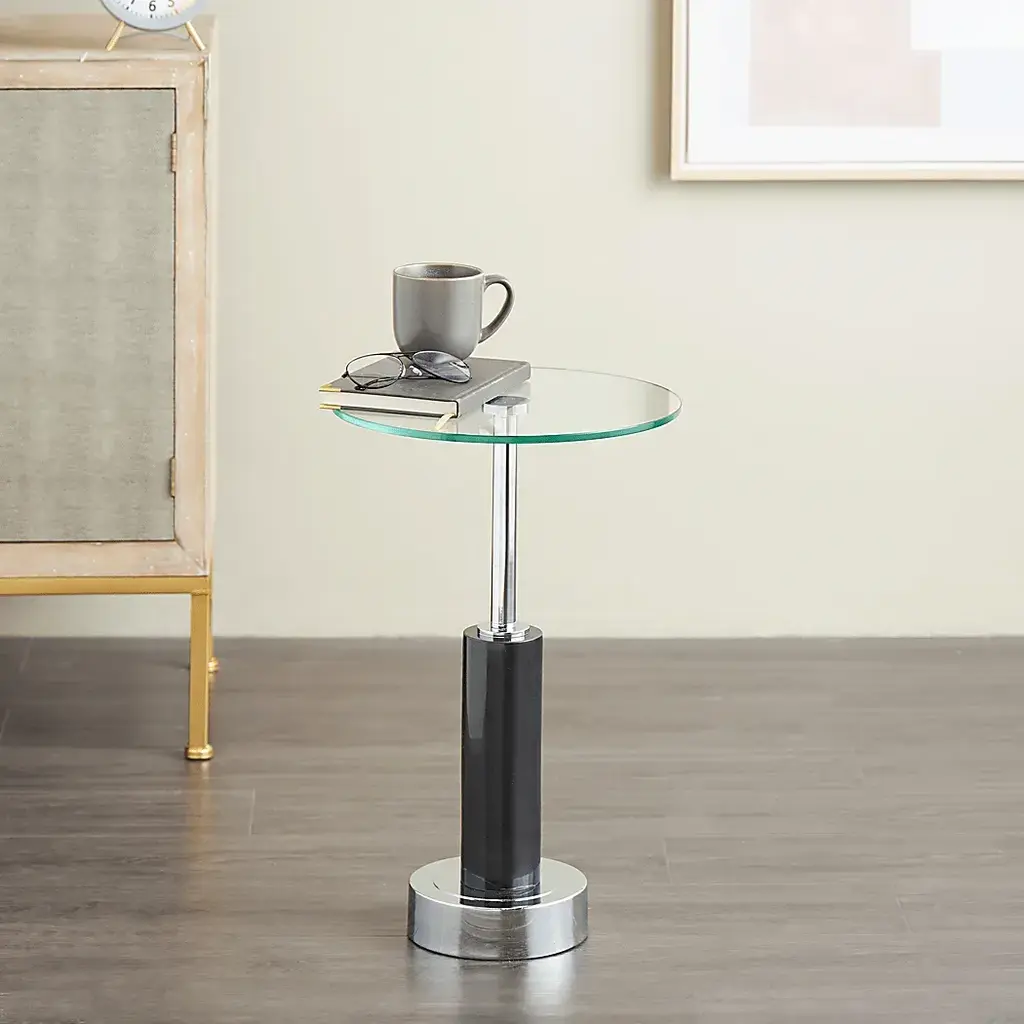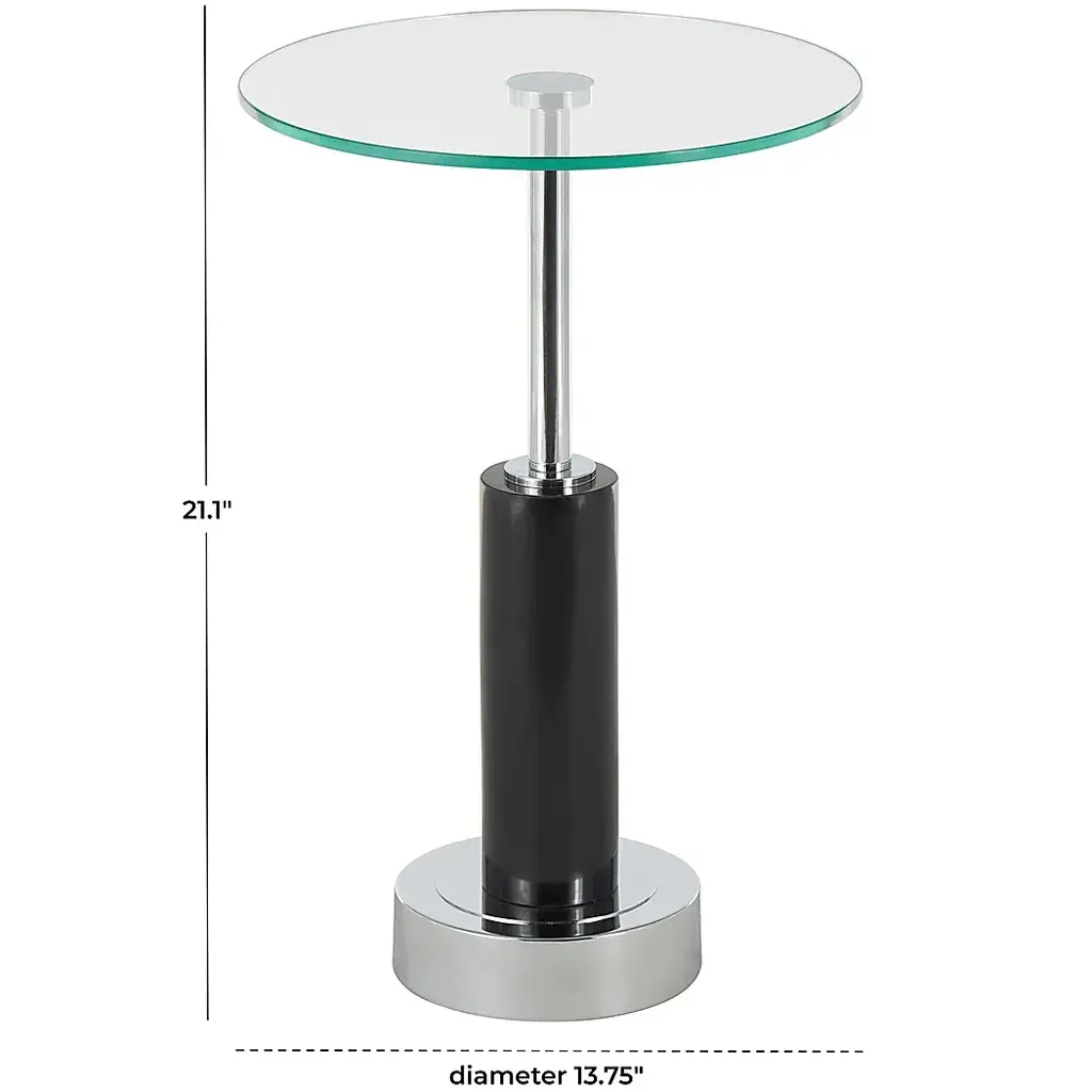 Indulge in the glamorous luxury of plush textures, dazzling details, and sleek finishes to elevate your home and add a sophisticated flair. The Jistar side end accent table is crafted from high-quality marble, glass, and metal. The round table boasts a sleek polished black marble finish with a clear tabletop, and a silver metal rod and base. This marble accent table features a sturdy silver metal rod and base, adding a touch of glamour and luxury to its design. Customer assembly required.