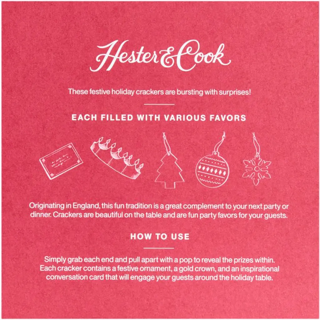 Liven up your holiday entertaining with these fun party favors. Wrapped in red-and-white paper featuring Joan Anderson's signature reindeer, each cracker contains hidden treasures. To access the concealed cache, pull the cracker on either end until it breaks open with a pop to reveal a festive ornament, gold crown and a conversation card.