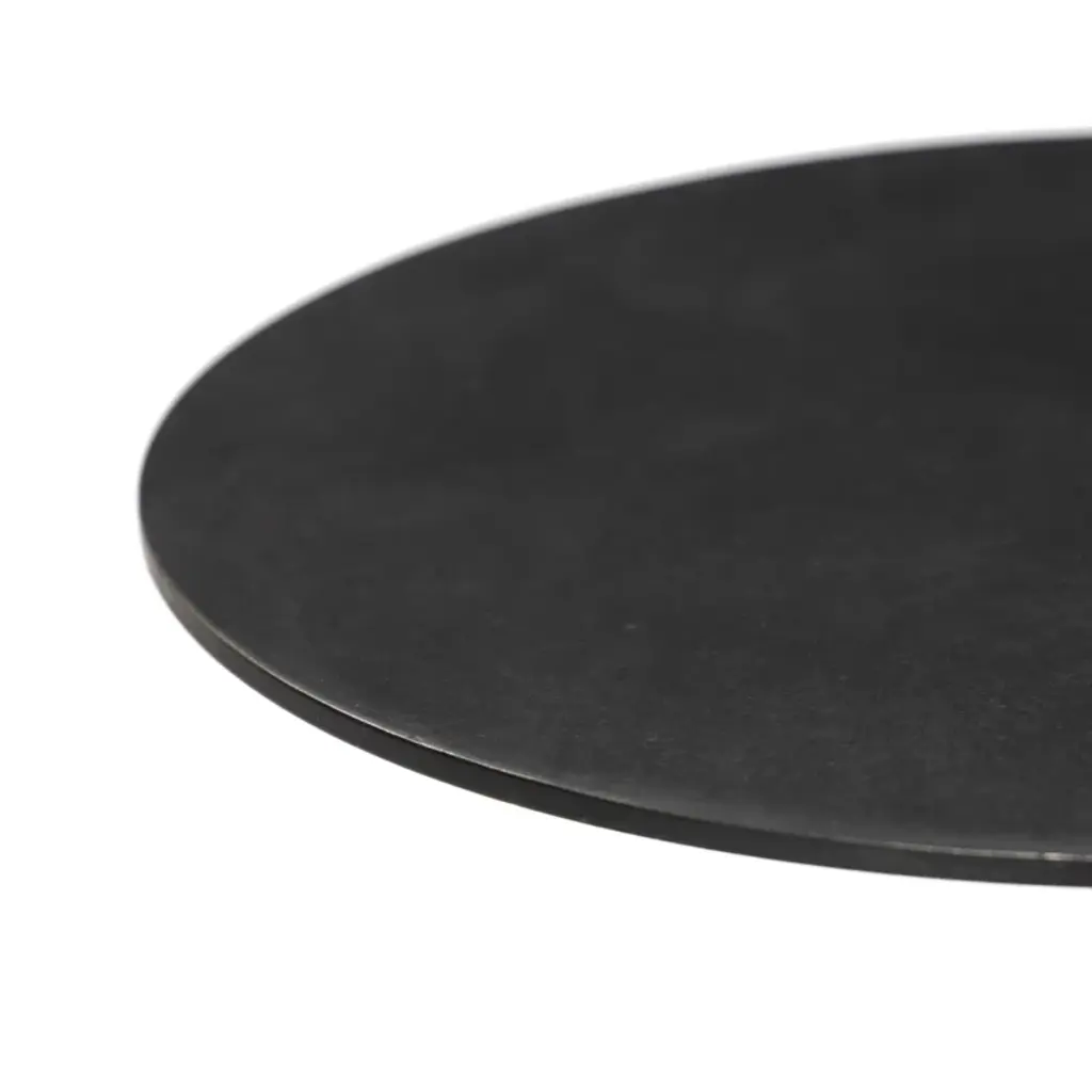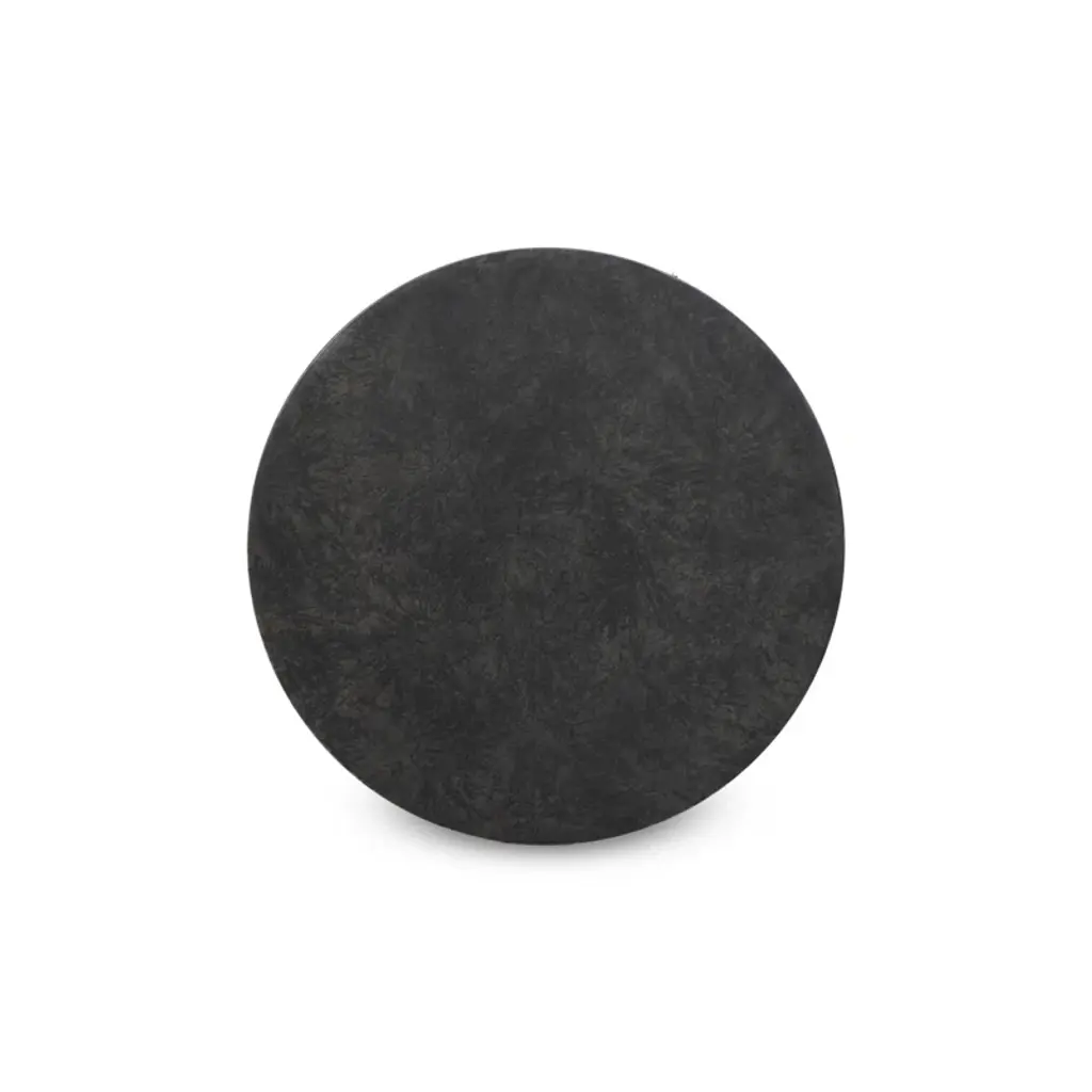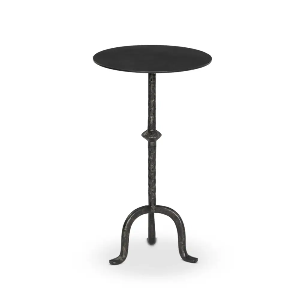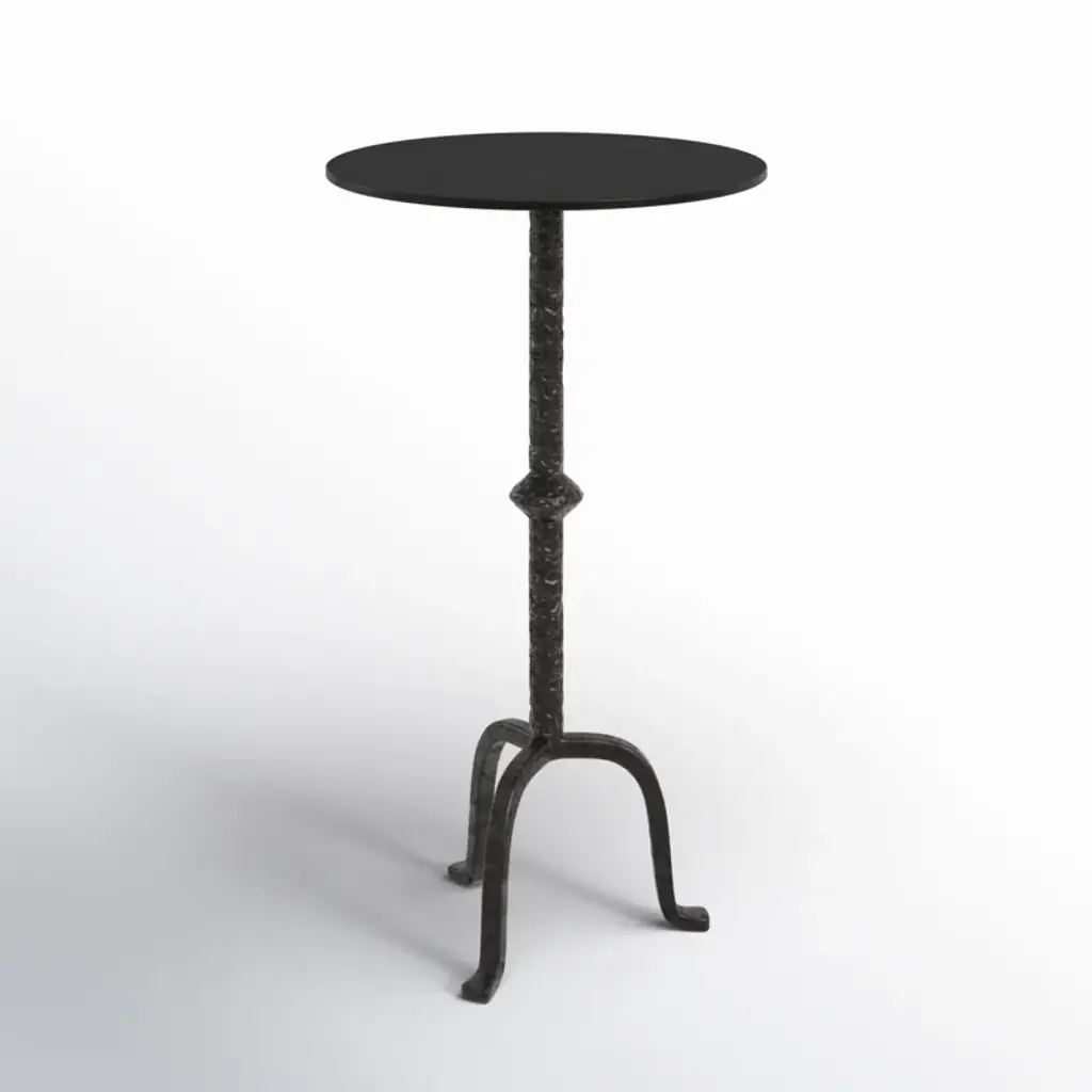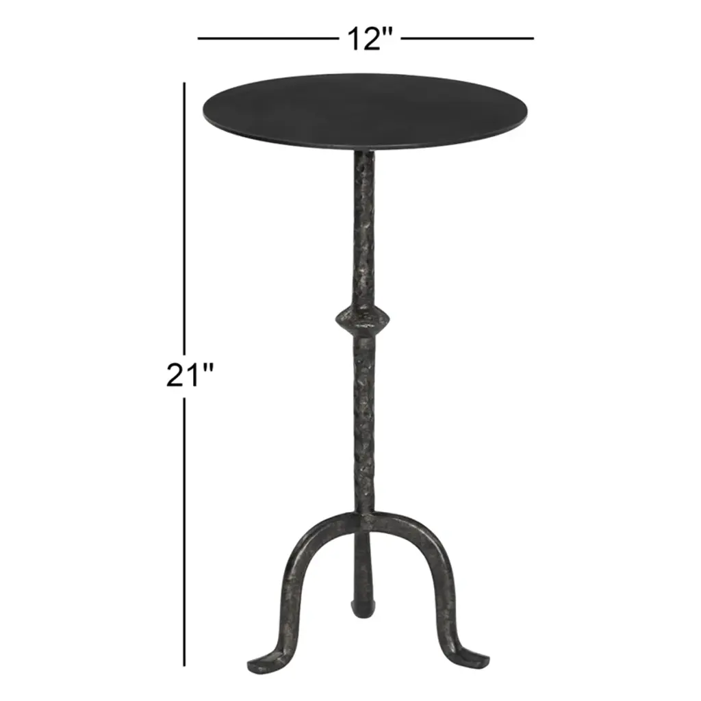 Textured black cast metal forms a turned post atop three curved legs, for an antiqued metalwork look. A round top completes this versatile accent, bridging heritage and contemporary styles.