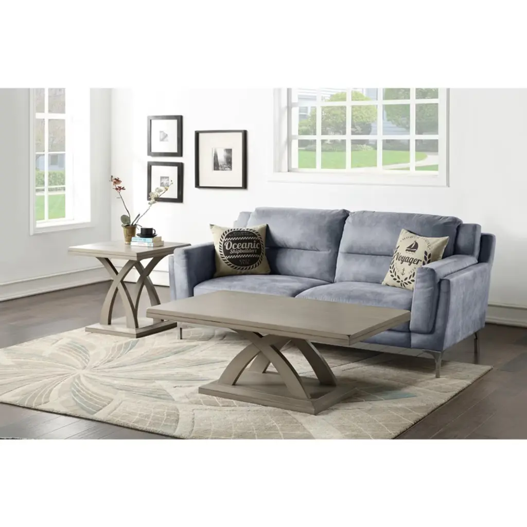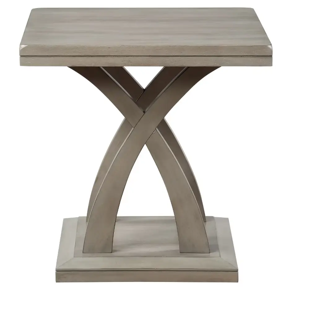 Constructed from hardwood solids and mango veneersCollection features a decorative base and thick double edge tops constructed of hardwood solids and mango veneersLevelers adjust table for uneven floorsGrey finish