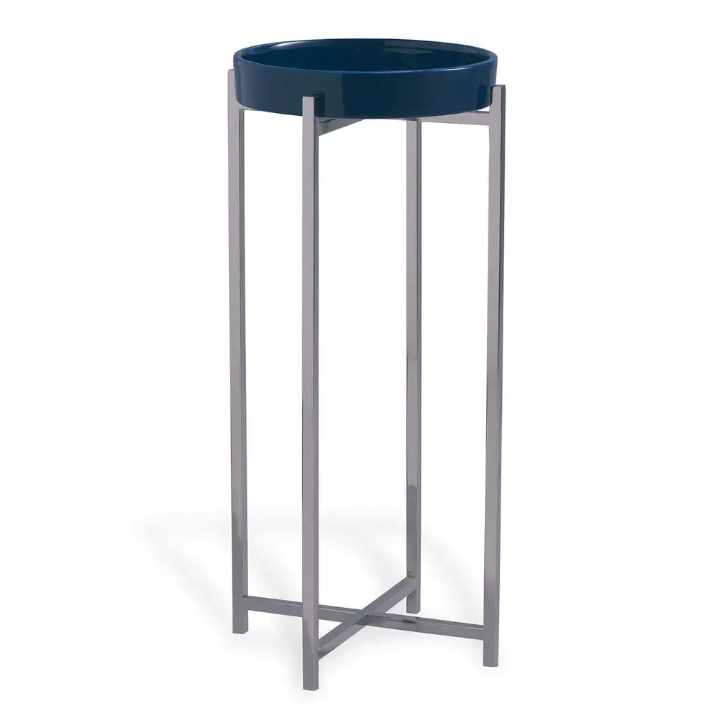Jody is our bright and colorful cleaned lined accent table which features a porcelain tray top in a navy glaze. Accented with nickel polished solid steel base. Tray top is NOT removable. Porcelain tray top measures: 9.5" diameter Overall Measurements: 23"H x 11" Diameter Materials: Steel, porcelain Indoor use only. Clean with soft dry cloth At Port 68, our porcelain pieces are handcrafted and fired at extremely high temperatures, and as a result, slight variations may occur. The glaze color of the finished product may differ slightly from the images displayed online.
