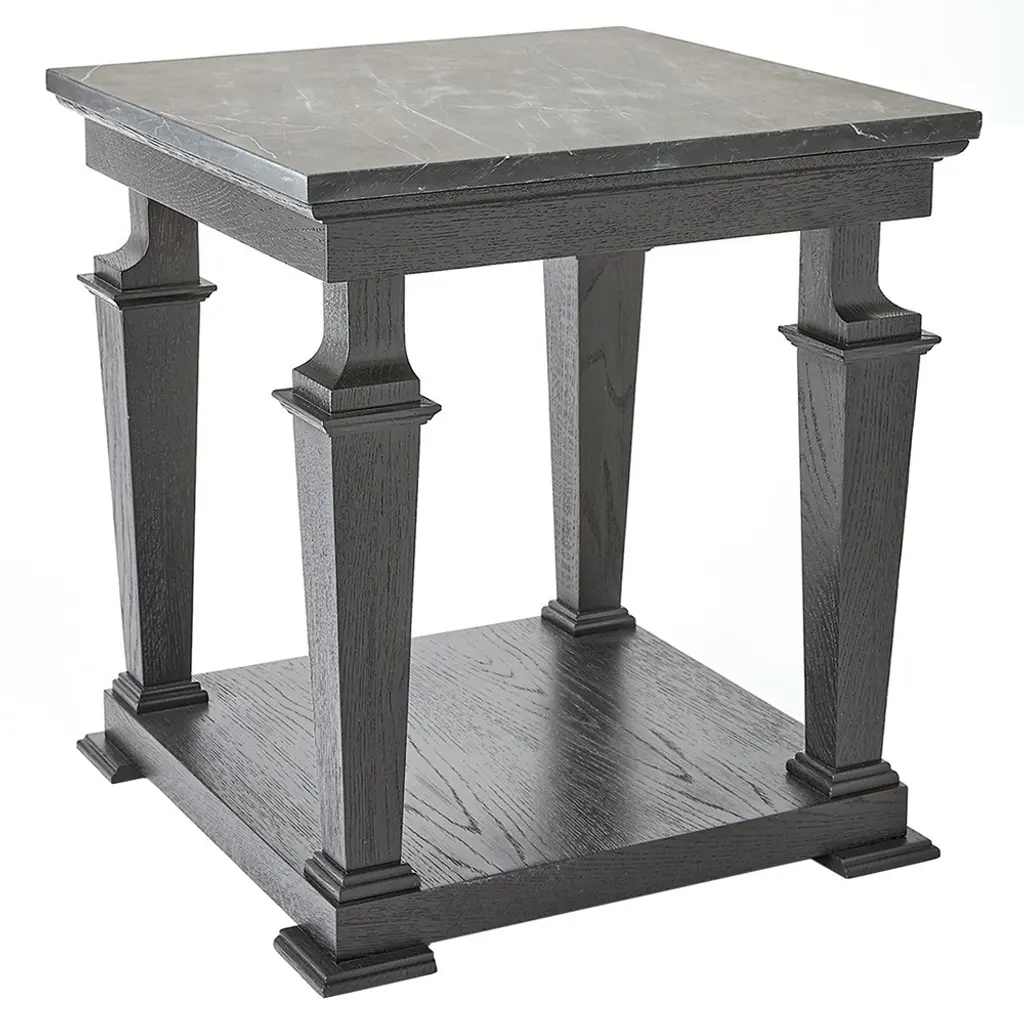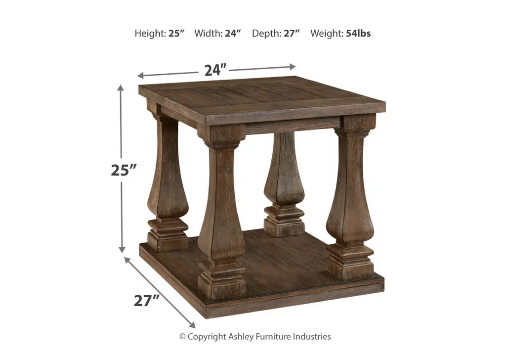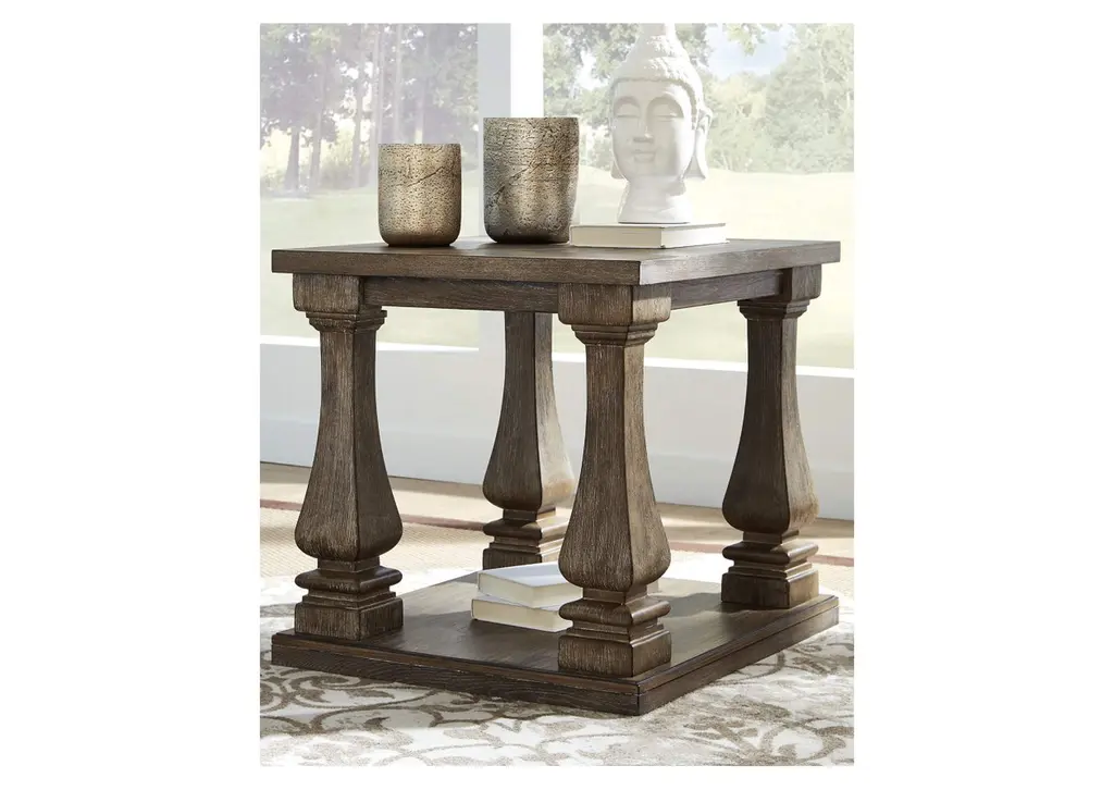 Homey. Hearty. Heavenly hued. Luring with a distressed weathered gray finish and square baluster legs set on a broad lower shelf for great presence, the Johnelle end table is sure to make your homestead feel that much more like home. The look is beautified with elm veneers and a framed and plank-effect tabletop for a richly crafted masterpiece made for years of satisfaction. Weight 53.000 lbs. (23.85kgs.)