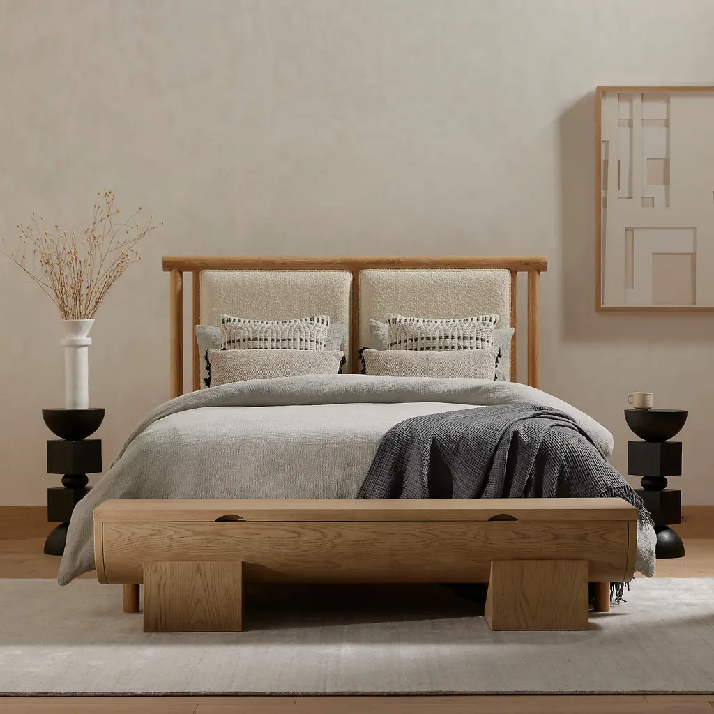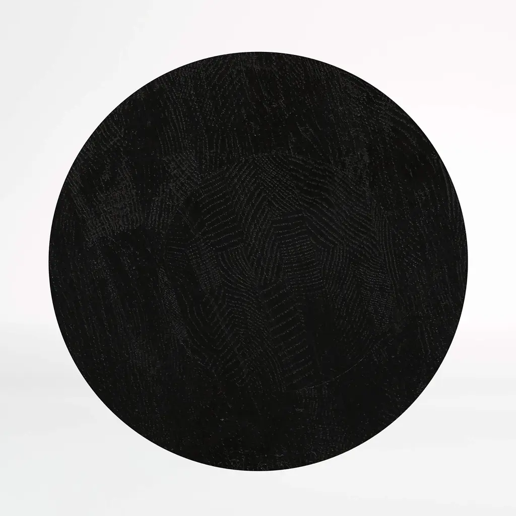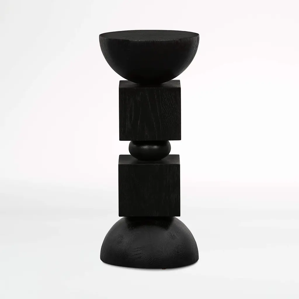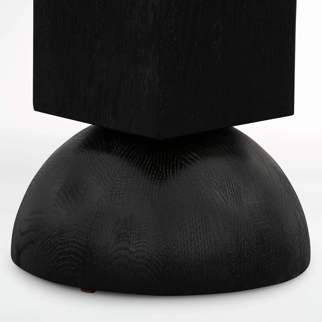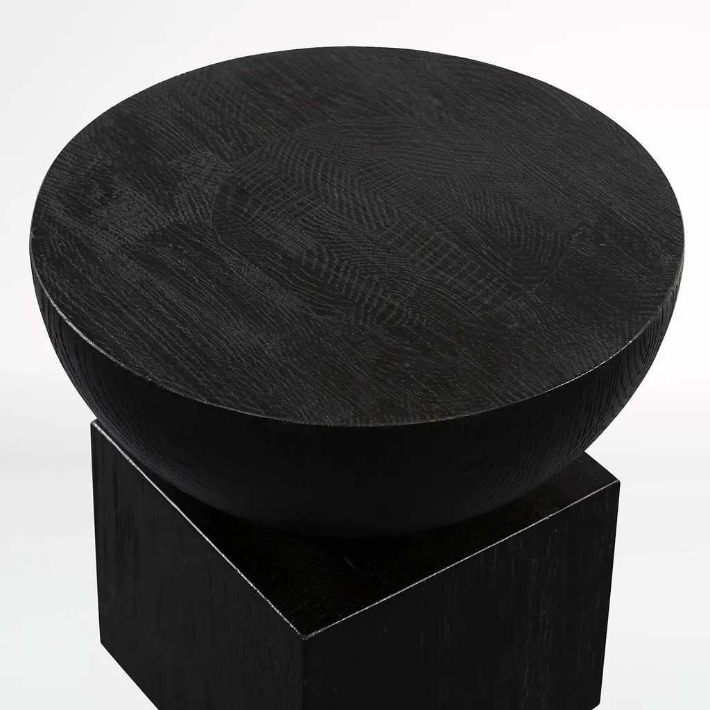 Like a work of modern sculpture, our Jordan black drink table plays with geometric shapes in natural solid oak. A stack of two cubes and an ovoid sphere build the supporting column, while two hemispheres form the base and top, finished in ebony to create a graphic silhouette. For gallery-worthy impact, pair the drink table with the coordinating Jordan end table in natural or black. The Jordan accent table collection is a Crate & Barrel exclusive.