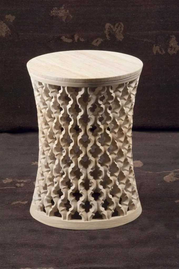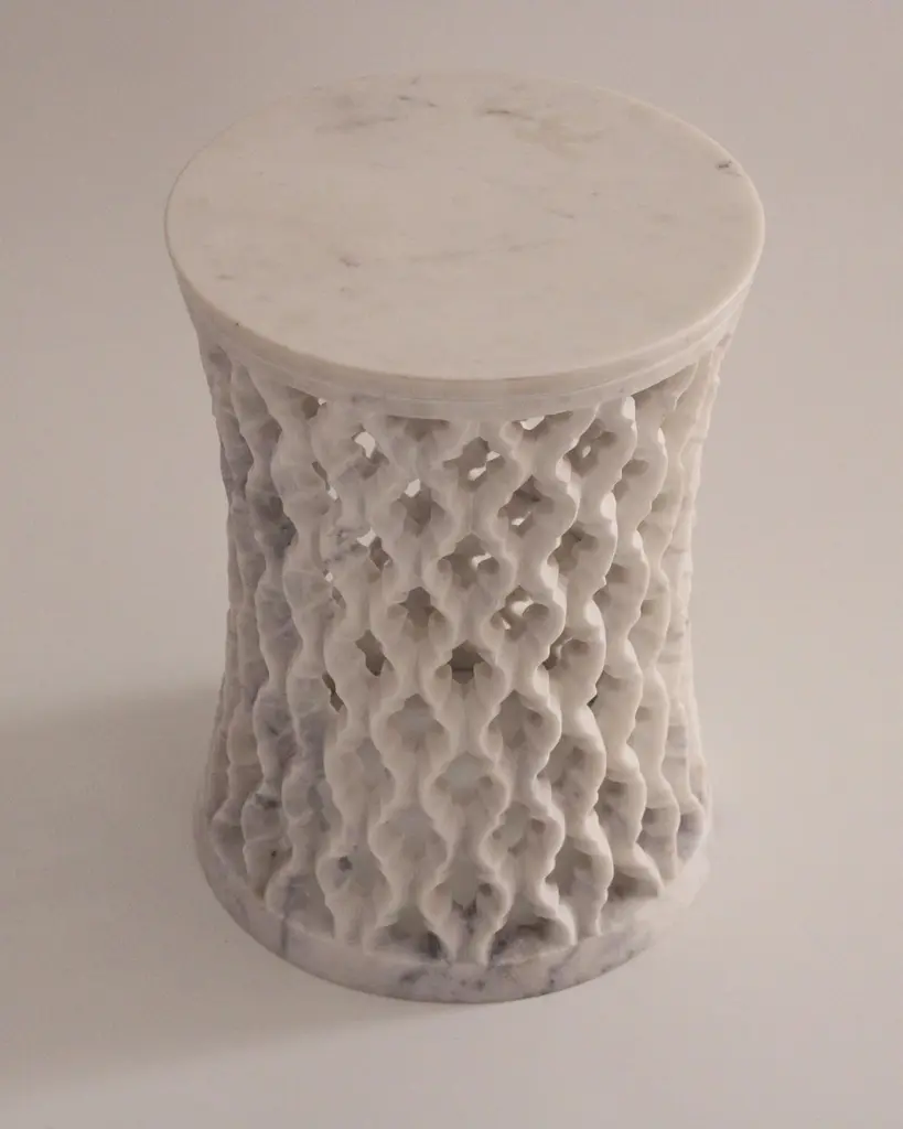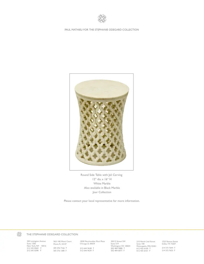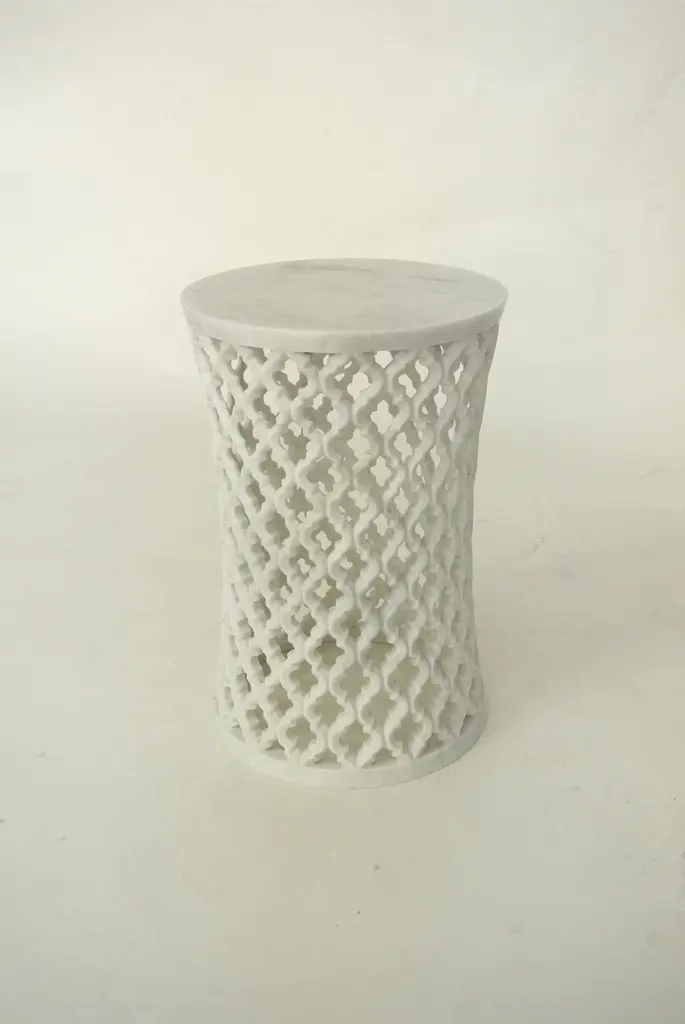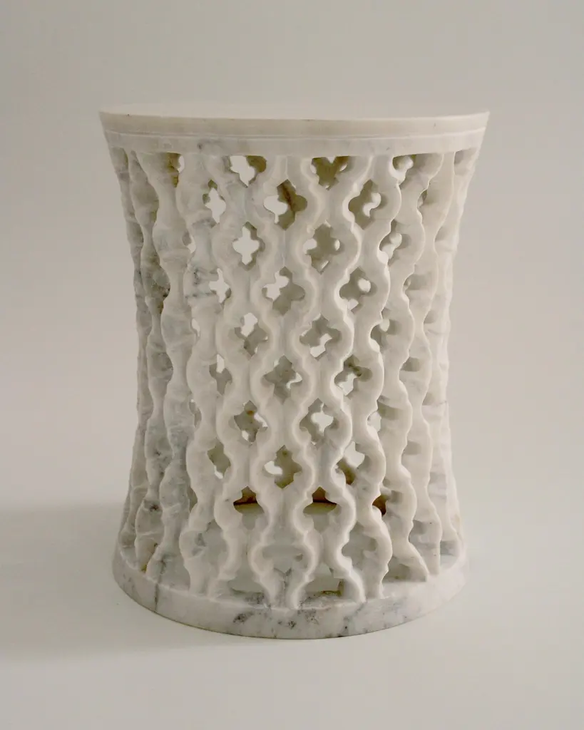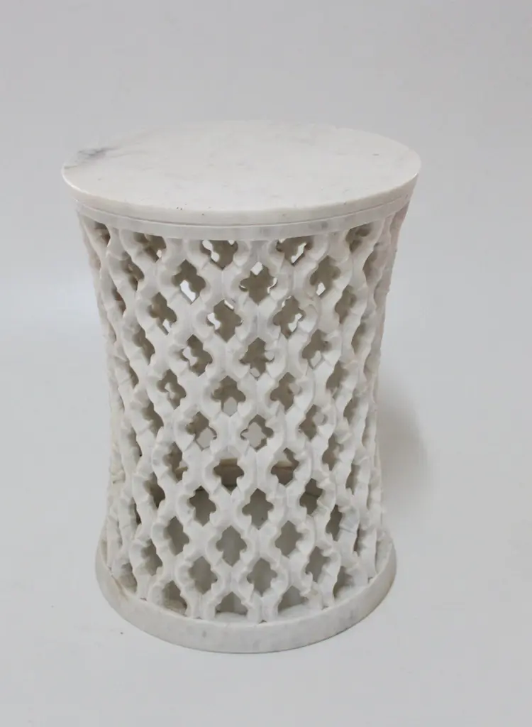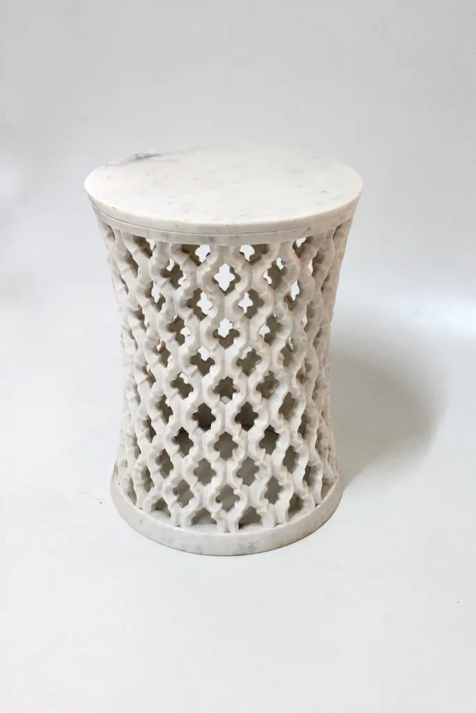 Inspired by the elegant pierced marble “jali” screens and windows he saw in the palaces of Mughal India, the renowned designer Paul Mathieu created a unique collection of hand carved side tables. Solid blocks of marble are hollowed out and hand-carved into low elegant tables through which light and air pass with ease. The intricate jali patterns are first traced onto the surface of the stone. Craftsmen then hand chisel and form hundreds of intricate, interlocking patterns in each piece before the tables are polished by hand. Jour Jali Round Table in White Marble Size- 12"x12"x16"HMaterials -White Marble, Hand-Crafted, Semi matt finishedBuyer Cancellation-The cancellation charge is 25% which increases to 50% if the production is started.Prices do not include shipping from India (for custom orders) or our MN warehouse (items from stock). That will be additional.