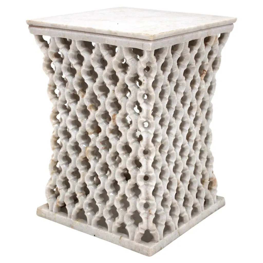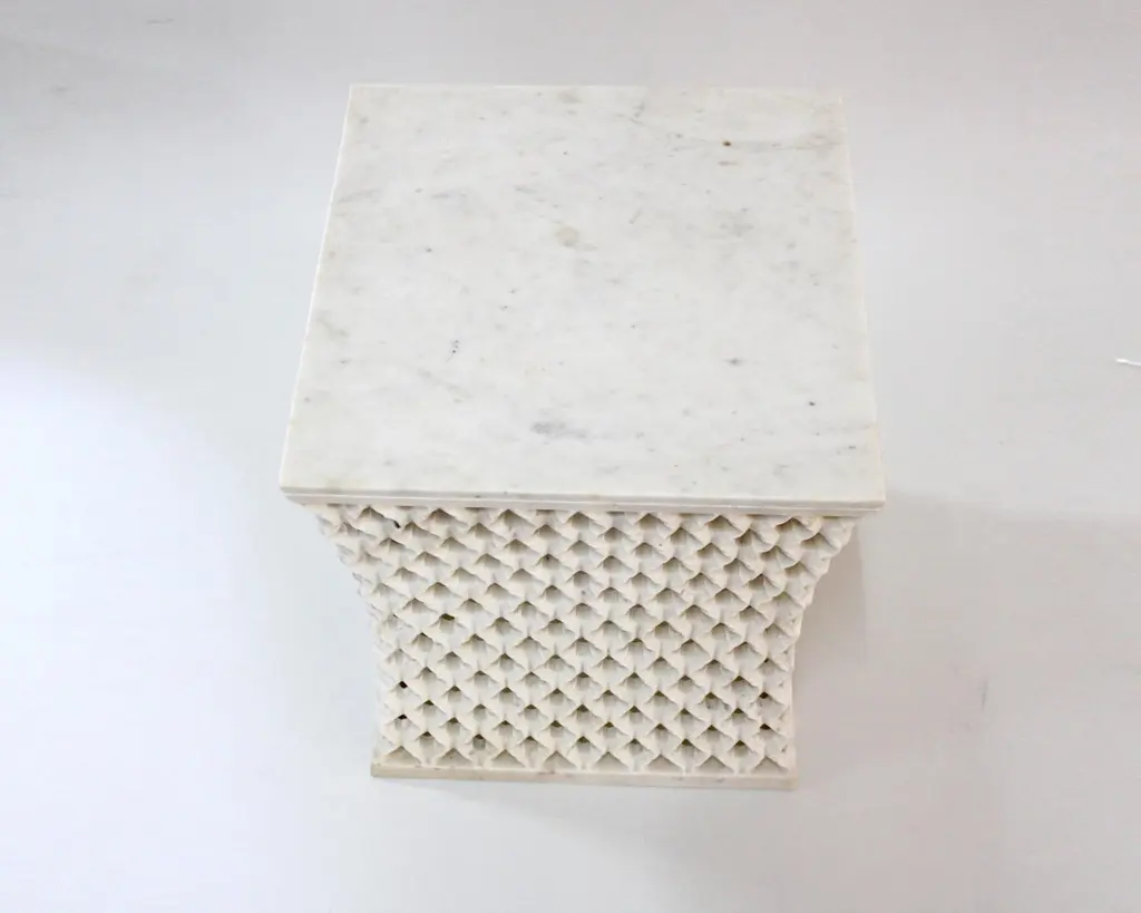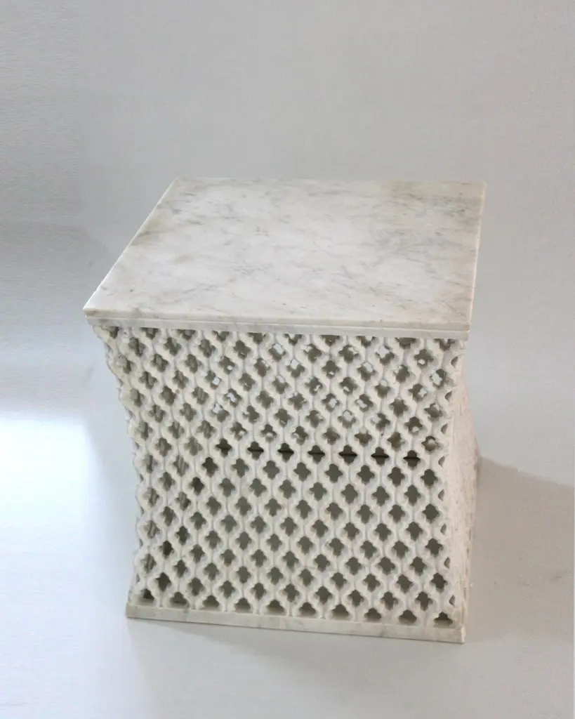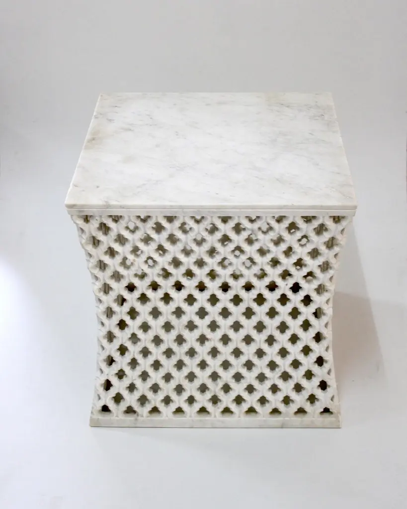 Inspired by the elegant pierced marble “jali” screens and windows he saw in the palaces of Mughal India, the renowned designer Paul Mathieu has created a unique collection of hand-carved side tables. Manufacture: Solid blocks of marble are hollowed out and hand-carved into low elegant tables through which light and air pass with ease. The intricate jali patterns are first traced onto the surface of the stone. Craftsmen then hand chisel and form hundreds of intricate, interlocking patterns in each piece before the tables are polished by hand.Jour Jali Square Table in White Marble Size- 24"x24"x24"H Materials - White Marble, Hand-Carved, Semi matt finishedBuyer Cancellation-The cancellation charge is 25% which increases to 50% if the production is started.Prices do not include shipping from India (for custom orders) or our MN warehouse (items from stock). That will be additional.