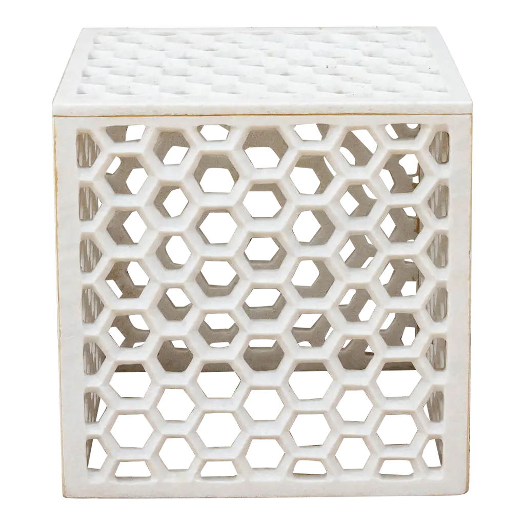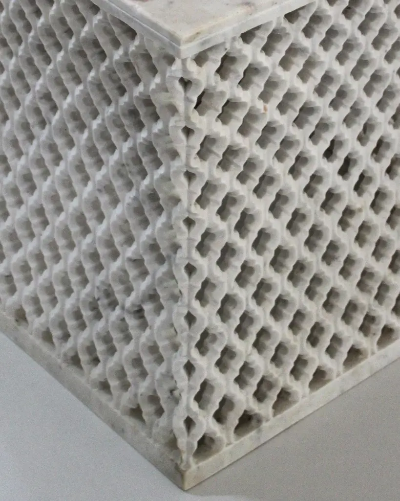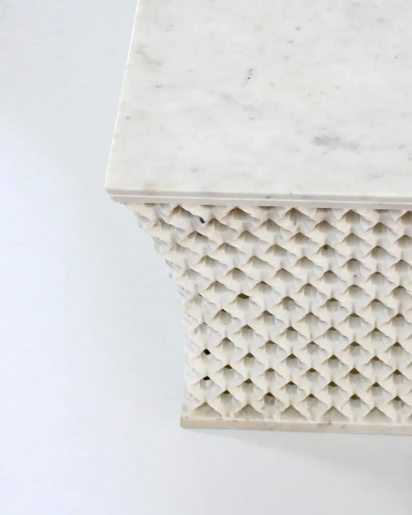 Inspired by the elegant pierced marble “jali” screens and windows he saw in the palaces of Mughal India, the renowned designer Paul Mathieu has created a unique collection of hand-carved side tables. Manufacture: Solid blocks of marble are hollowed out and hand-carved into low elegant tables through which light and air pass with ease. The intricate jali patterns are first traced onto the surface of the stone. Craftsmen then hand chisel and form hundreds of intricate, interlocking patterns in each piece before the tables are polished by hand.Jour Jali Square Table in White Marble Size- 24"x24"x24"H Materials - White Marble, Hand-Carved, Semi matt finishedBuyer Cancellation-The cancellation charge is 25% which increases to 50% if the production is started.Prices do not include shipping from India (for custom orders) or our MN warehouse (items from stock). That will be additional.