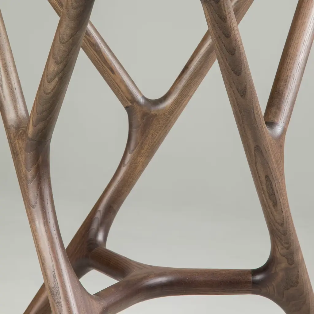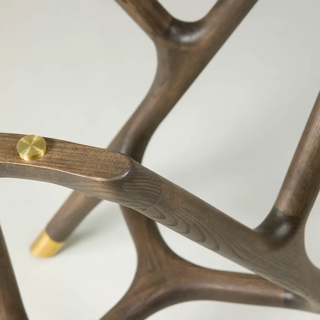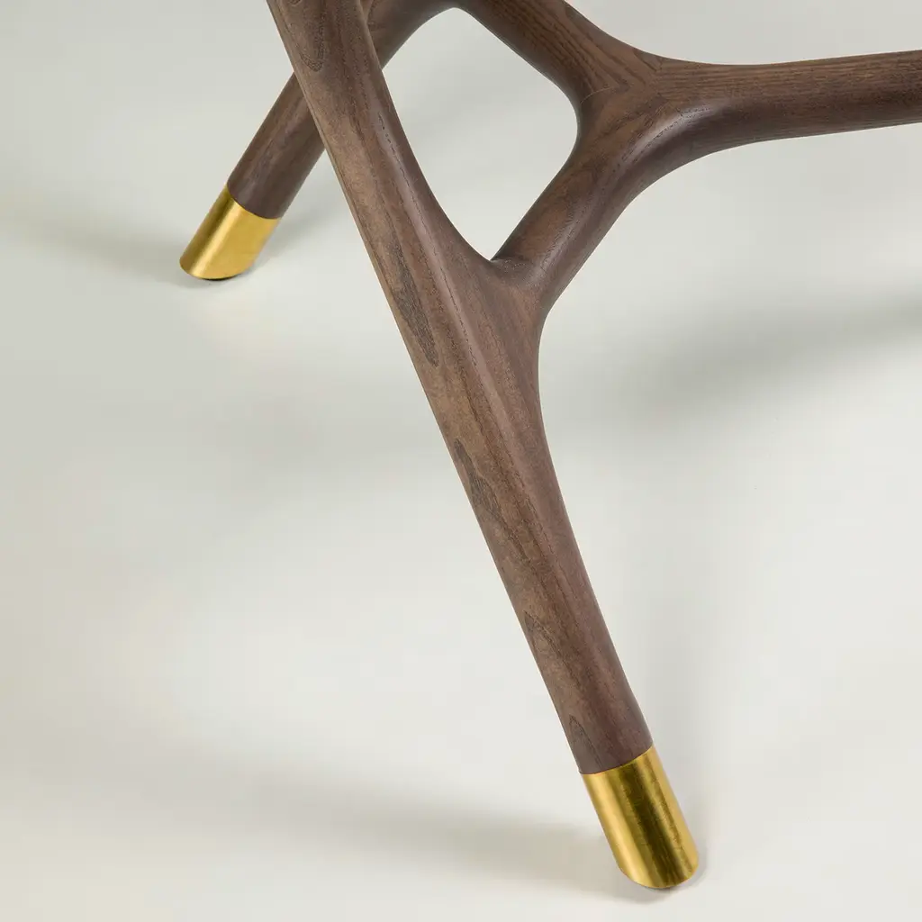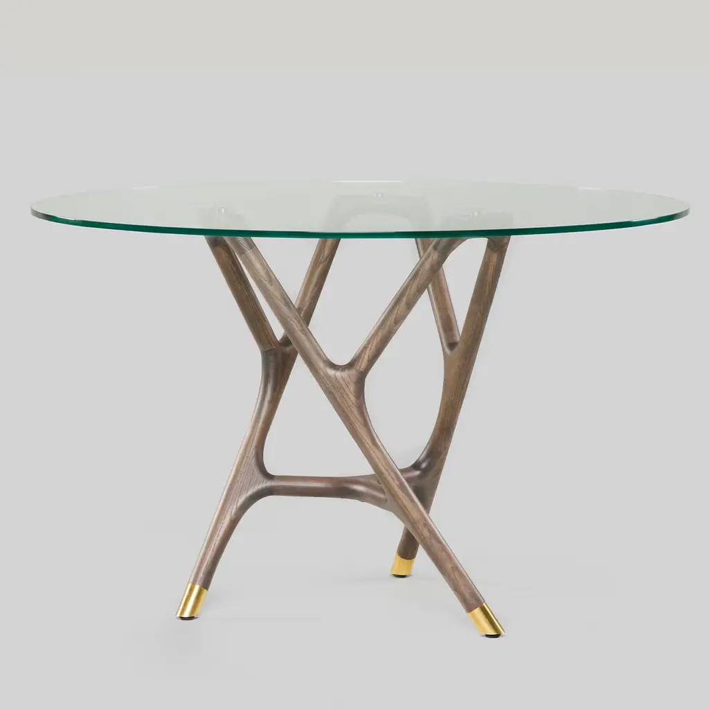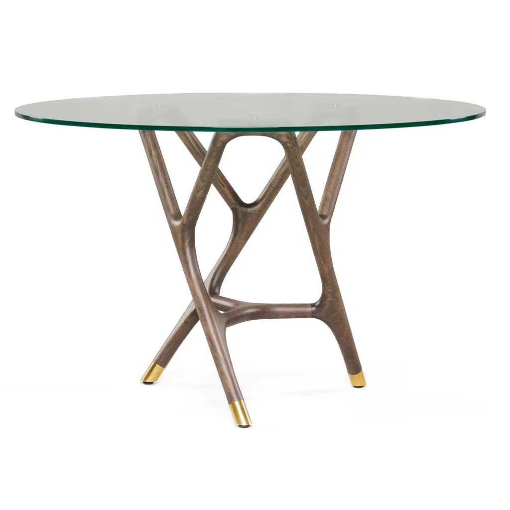 A retro-chic allure defines this exquisitely crafted table. The carved ash wood Decò-inspired table legs with brass feet supporting the 120cm diameter glass top complete the piece. This piece will make a refined coffee table or side table in a classic or contemporary interior, blending into any decor with ease.