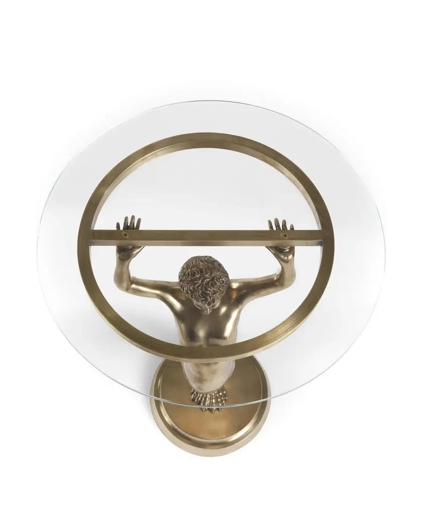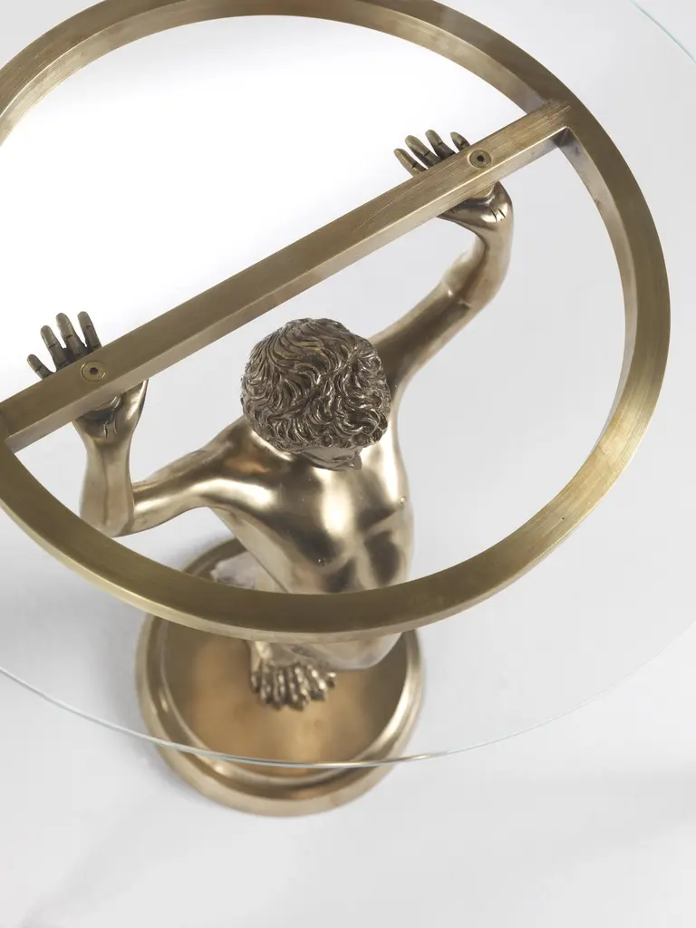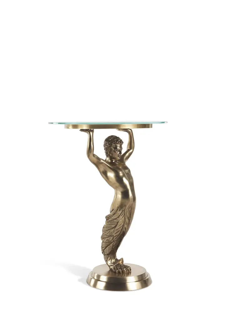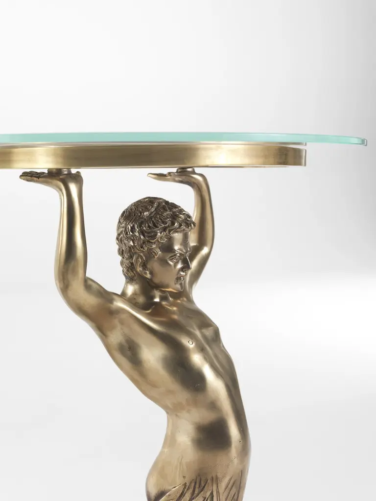 A sculptural small table of mythological and naturalistic inspiration, with a statues in brass casting representing the legendary character "Fauno", supporting the precious crystal top.Fauno sculptural side table with male figure in lost-wax cast brass. Top in bevelled glass.