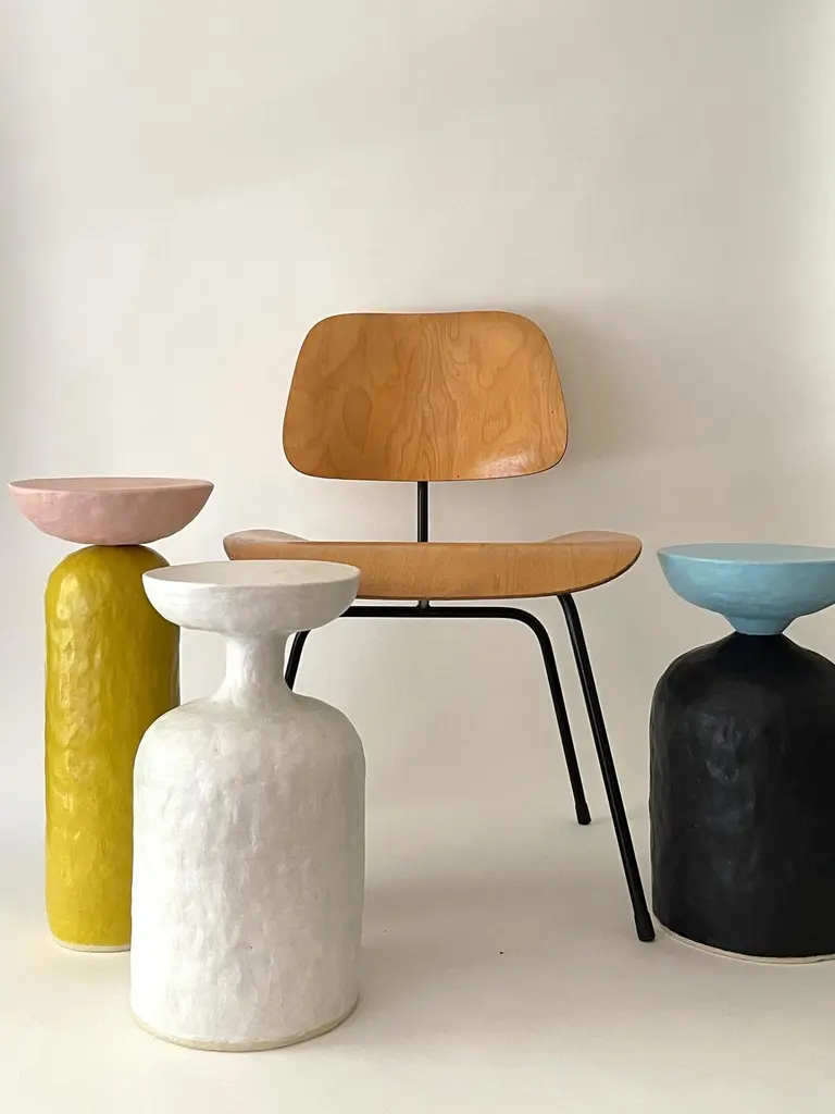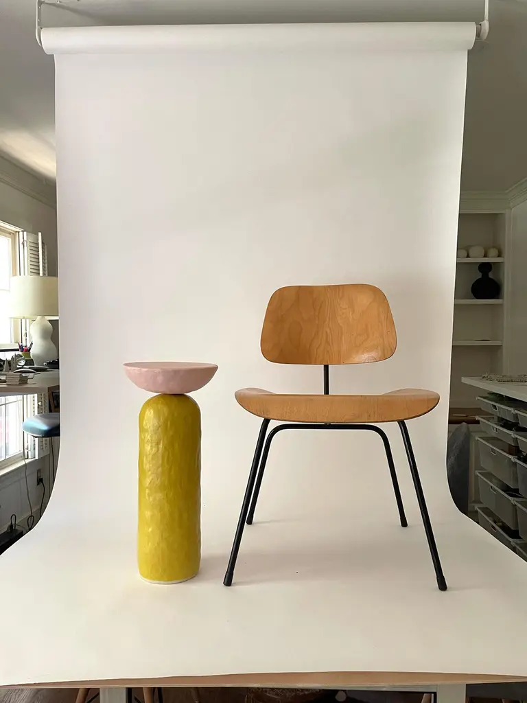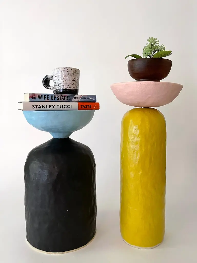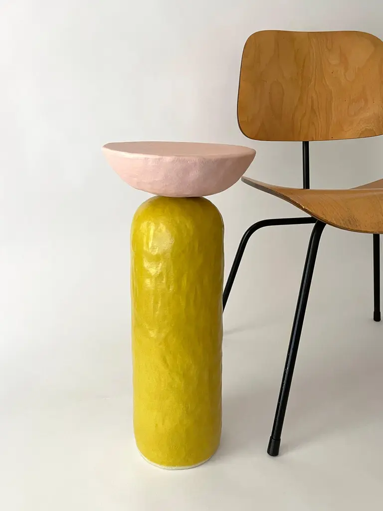 June Side Table by Meg MorrisonMaterials: Ceramic.Dimensions: D 23 x H 51 cm.Meg Morrison is an artist in Richmond, Virginia currently working in ceramics. Meg holds an MFA in graphic design from Virginia Commonwealth University. Her work in the field of design developed her attention to detail, color and restraint. Years spent on the practice of woodturning taught her hands the mastery of a curve. Ceramics now opens up her work to a larger scale. Her goal is to craft simple and bold pieces to complement fresh modern interiors.Meg hand builds all of her pieces through a process called coil building. Years spent practicing woodturning taught her hands the mastery of a curve. Her work as a graphic designer informs the bold yet simple color palette. The craft of making these pieces brings her happiness.