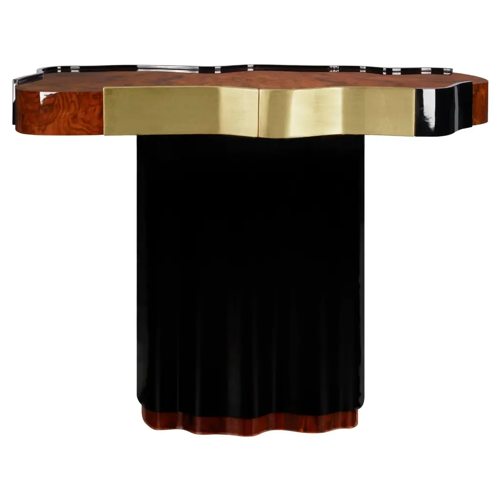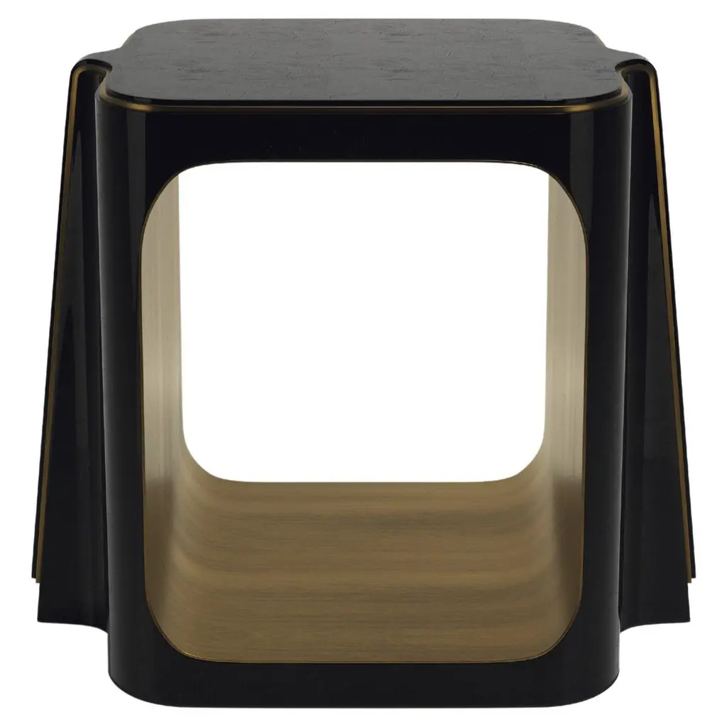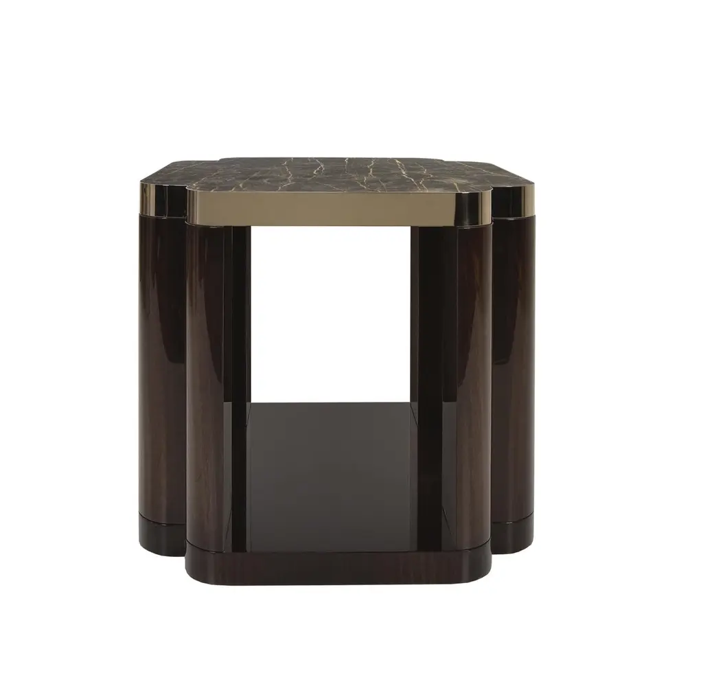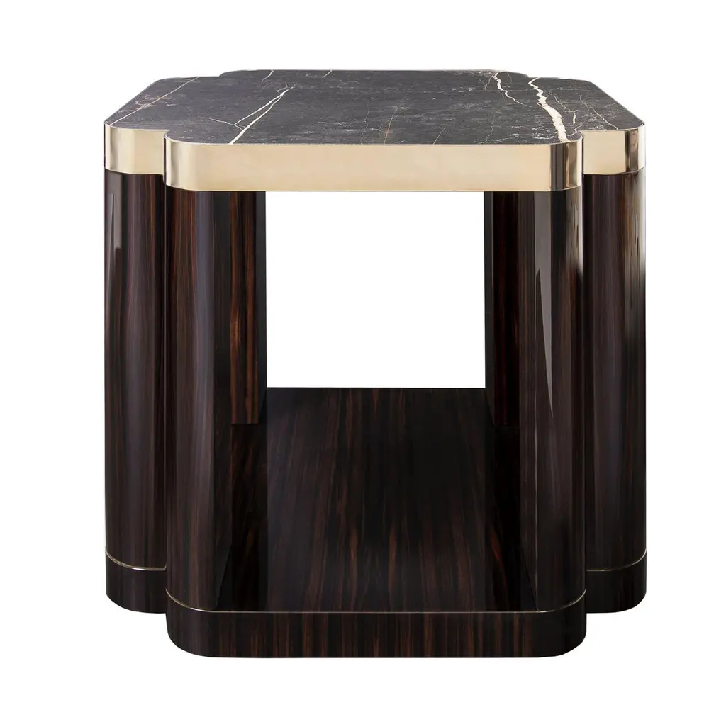 A study in balance and material contrast, this side table combines the warmth of Ebony wooden with the subtle elegance of its marble top. Its design is defined by its ebony legs connected to each other, supporting an organic Emperador marble top with smoke brass details. The duality of light and dark tones creates a striking architectural presence, while discreet brass details at the base add a refined note of sophistication.