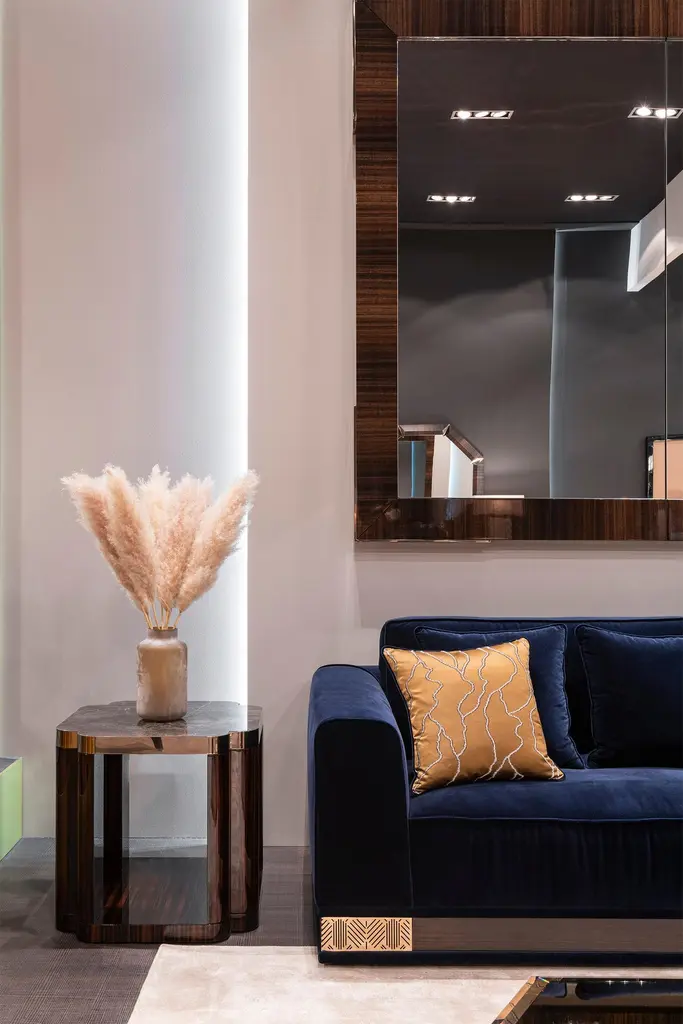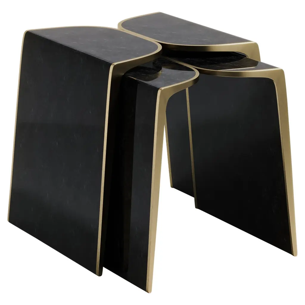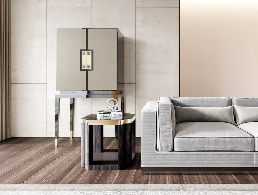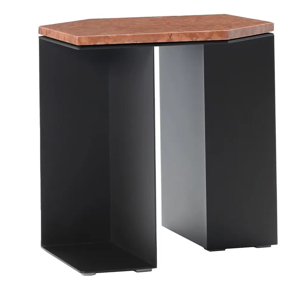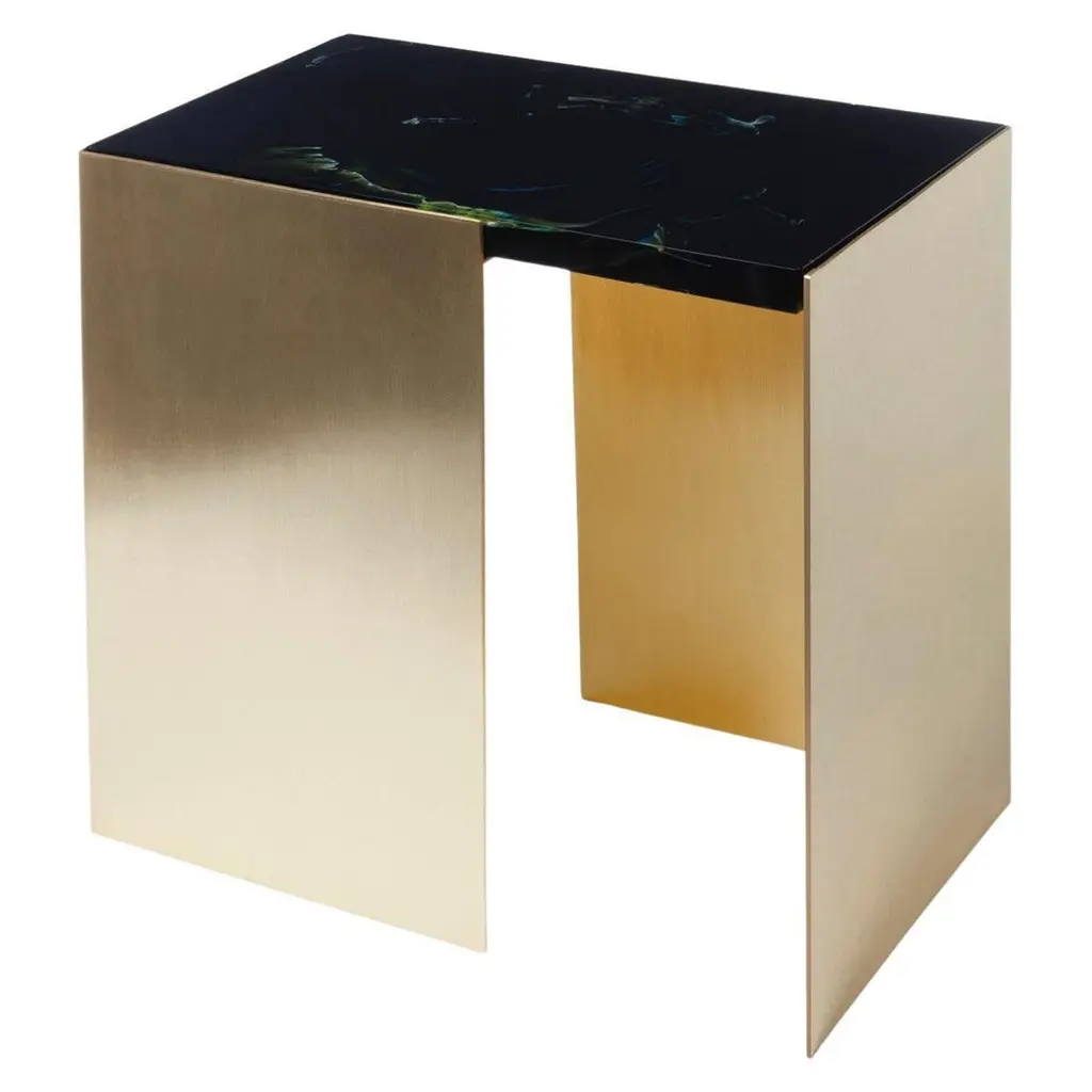 A study in balance and material contrast, this side table combines the warmth of Ebony wooden with the subtle elegance of its marble top. Its design is defined by its ebony legs connected to each other, supporting an organic Emperador marble top with smoke brass details. The duality of light and dark tones creates a striking architectural presence, while discreet brass details at the base add a refined note of sophistication.