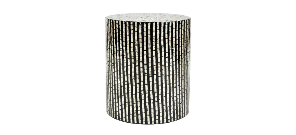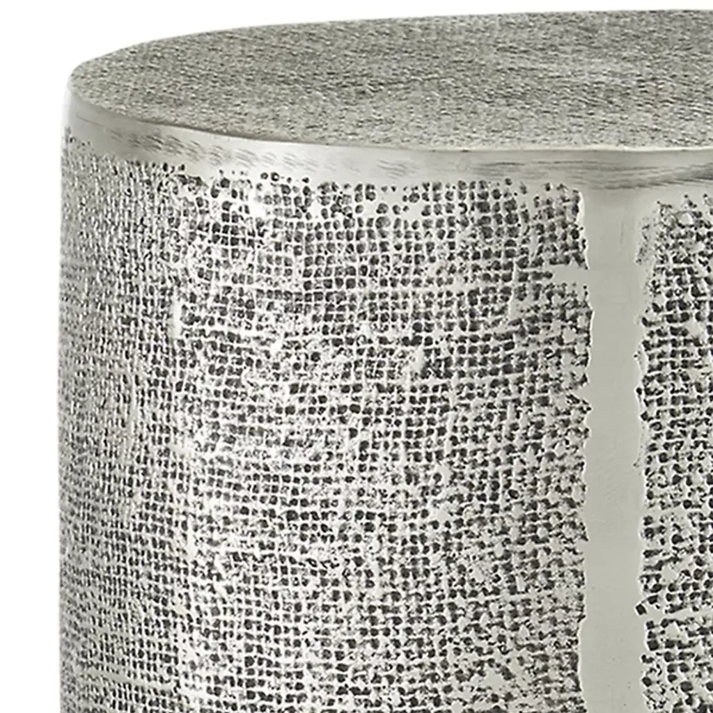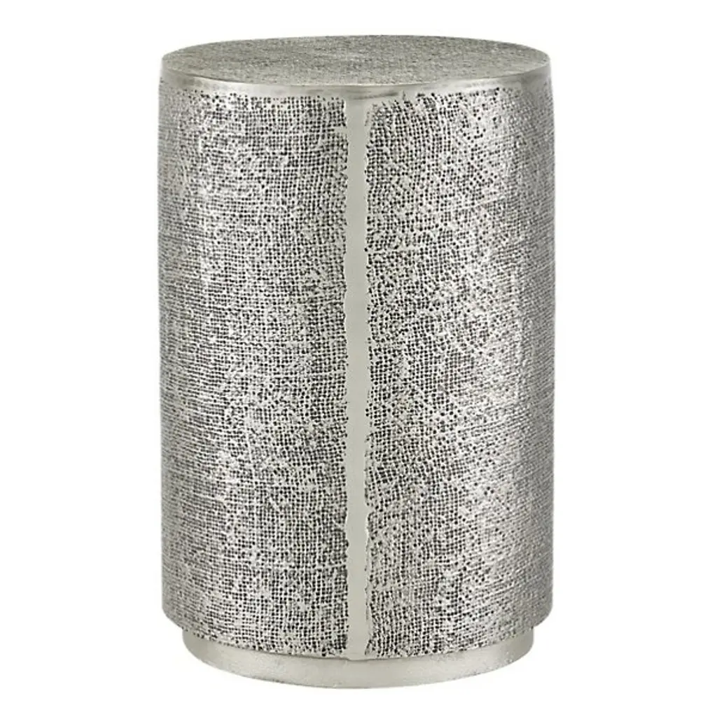 The Kabeen Side Table from Currey & Company is a feat of industrial artistry. Its cylindrical form, crafted from cast aluminum, bears the imprint of burlap fabric used in the molding process, creating a unique tactile surface. Three distinct mold lines encircle the piece, proudly displaying its handcrafted origins. The table's base and these lines are meticulously polished, contrasting with the textured body. The Kabeen Side Table proves that functional objects can be elevated to art, bringing a touch of sculptural intrigue to any space it occupies.