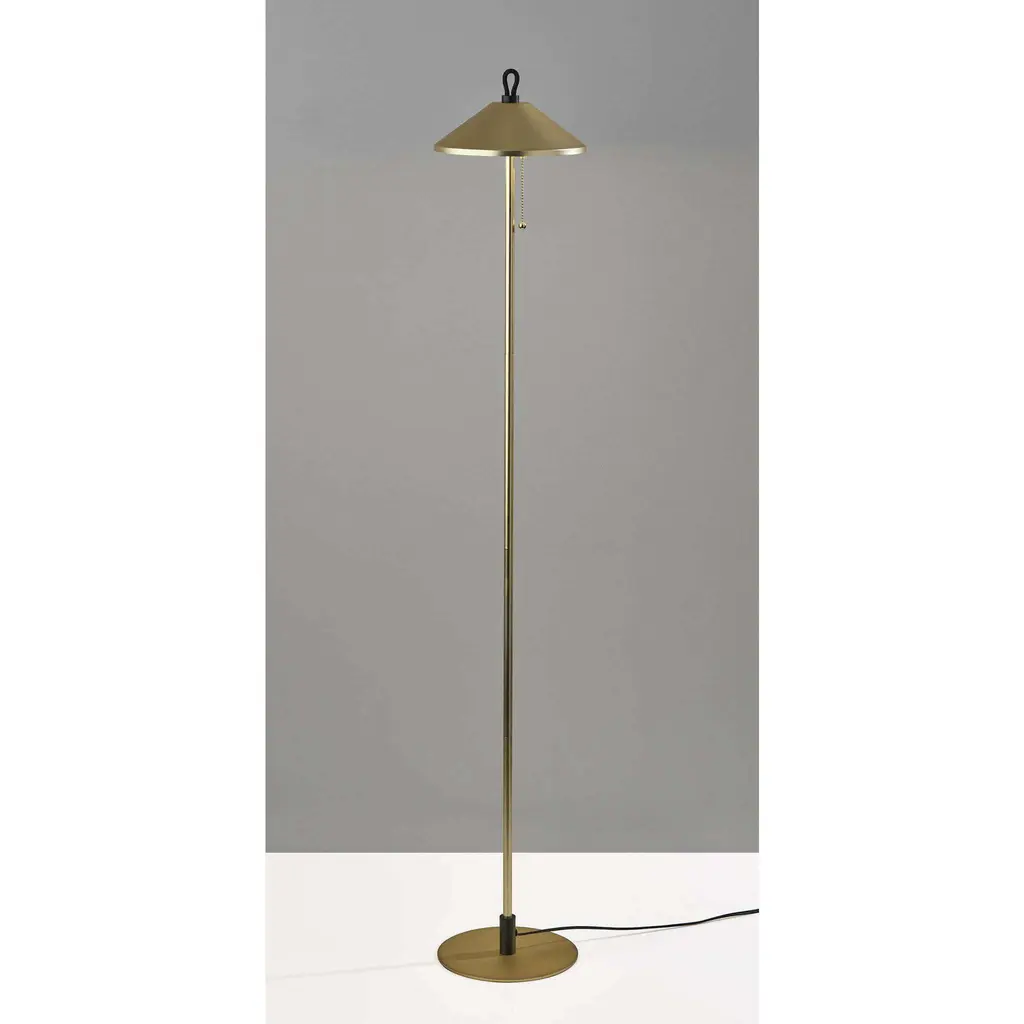 In classic form, the Kaden floor lamp's mixed metal finish and elegant design adds a polished accent to your space. Featuring a slim round base, thin pole and tapered conical shade, the dual-metal design is crafted with a brass finish and beautifully contrasting black metal accents. Two 5W replaceable LED bulbs are included and illuminate your space with 450 lumens of warm light. A pull-chain switch in brass finish easily turns the light on or off, while the lamp is powered by a black fabric-covered cord. The Kaden floor lamp is also available with a black metal finish and brass accents. Complete your décor with the coordinating Kaden table lamp.